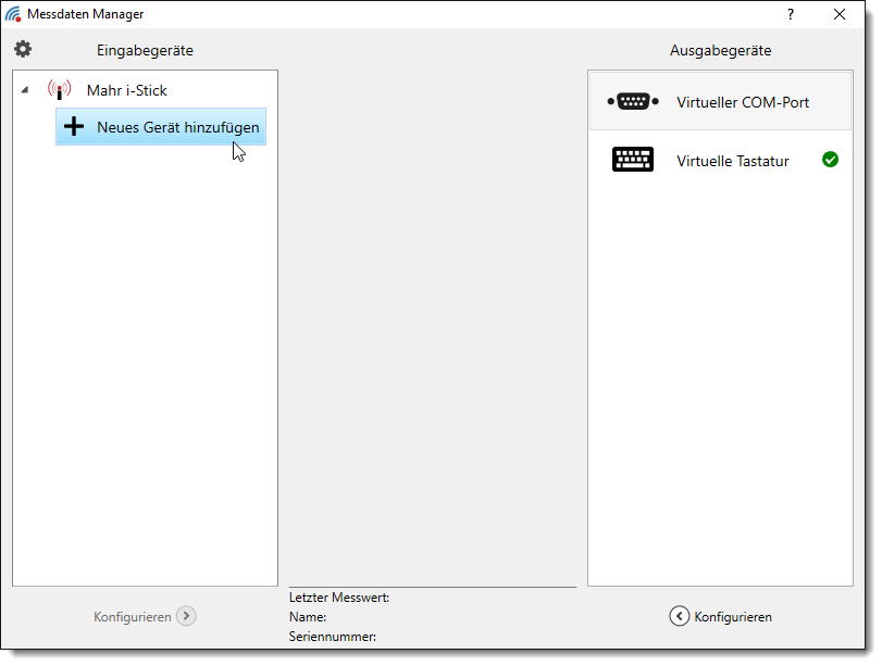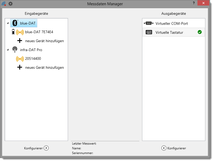 Wählen Sie nun per Mausklick das Messmittel aus, das Sie ankoppeln möchten. Danach klicken Sie auf die Schaltfläche Hinzufügen. Der Sender erscheint nun in der Liste der Eingabegeräte und wird automatisch mit dem Standard-Ausgabegerät Virtuelle Tastatur verbunden.