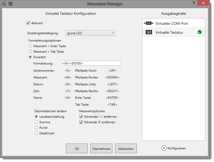 Als Ausgabegeräte stehen standardmäßig der virtuelle COM-Port und die virtuelle Tastaturschnittstelle zur Verfügung. Diese Ausgabegeräte können unterschiedlich konfiguriert werden.
