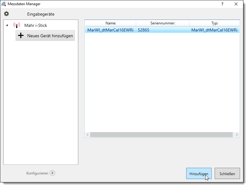 Um ein Mahr-Messmittel zur Liste Eingabegeräte hinzuzufügen, öffnen Sie durch einen Doppelklick auf den Platzhalter + neues Gerät hinzufügen im Listenbereich Mahr i-Stick die Geräteliste. In der Geräteliste sind alle Messmittel aufgelistet, die erkannt wurden.