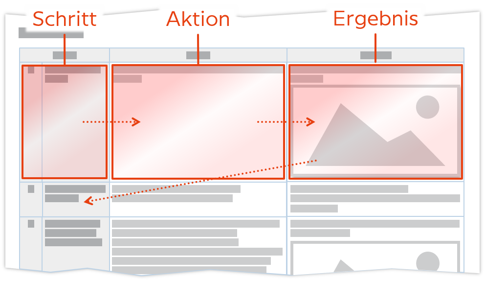 Arbeitsabläufe werden tabellarisch als Schrittfolgen beschrieben.