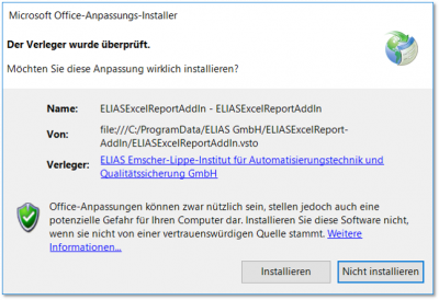 | 3 | Installation starten | Klicken Sie auf die Schaltfläche Installieren. Anmerkung Die Bestandteile des Excel Report Add-Ins werden in den folgenden Verzeichnissen installiert: Programm: %ProgramData%\ELIAS GmbH\ ELIASExcelReport-AddIn Konfigurationen und Vorlagen: %ProgramData%\ ELIAS GmbH\ELIASExcelReport Diese Pfade können nicht angepasst werden. Hinweis Abhängig von den Sicherheitseinstellungen für Ihren Benutzer auf dem PC können Sie vom Betriebssystem in einem Dialogfenster gefragt werden, ob dieses Programm bzw. diese App Änderungen auf diesem PC vornehmen darf. Stimmen Sie dieser Sicherheitsabfrage zu. | Die Software wird installiert. Die Schaltfläche Installieren hat sich in eine Statusanzeige für den Fortschritt der Installation gewandelt. Die vorherige Schaltfläche Schließen (des Installationsmanagers) ermöglicht nun einen Abbruch der Installation: |