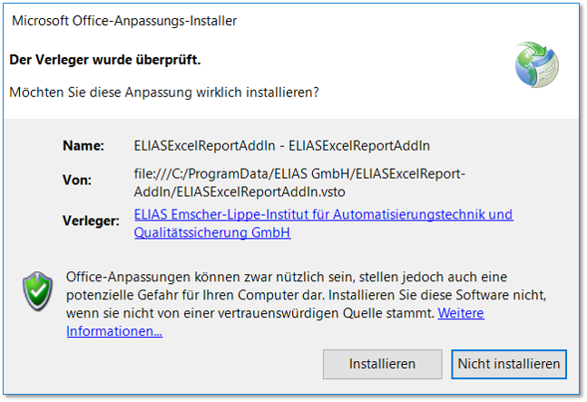 6 Excel starten Starten Sie Excel. Nach dem Start öffnet sich das Dialogfenster „Microsoft Office-Anpassungs-Installer“: