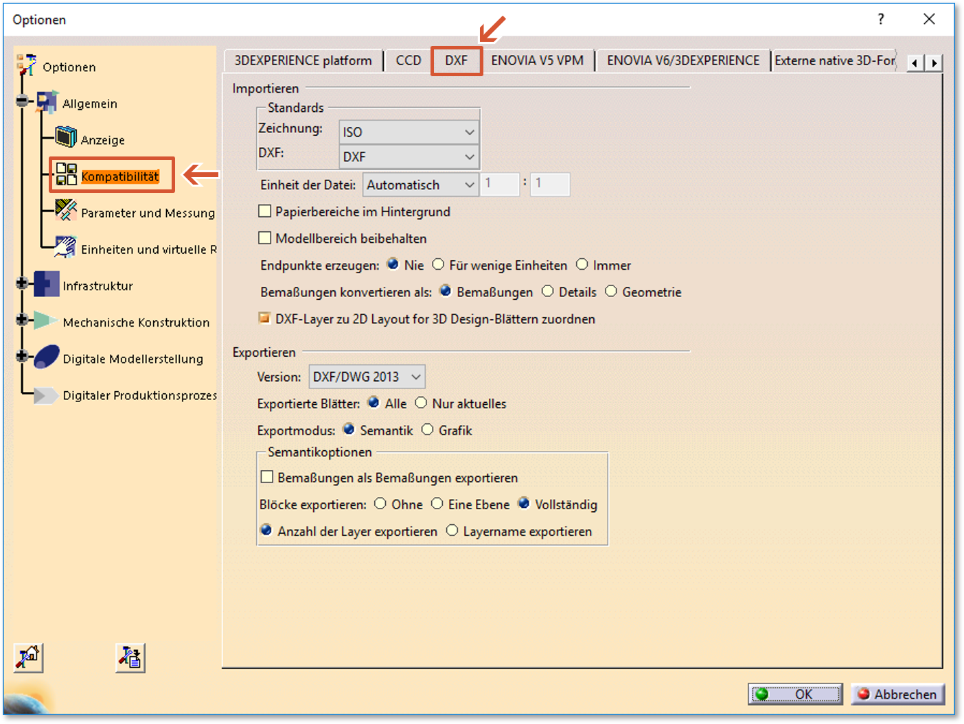 Exportoptionen Tools > Optionen > Allgemein > Kompatibilität > DXF > Exportieren