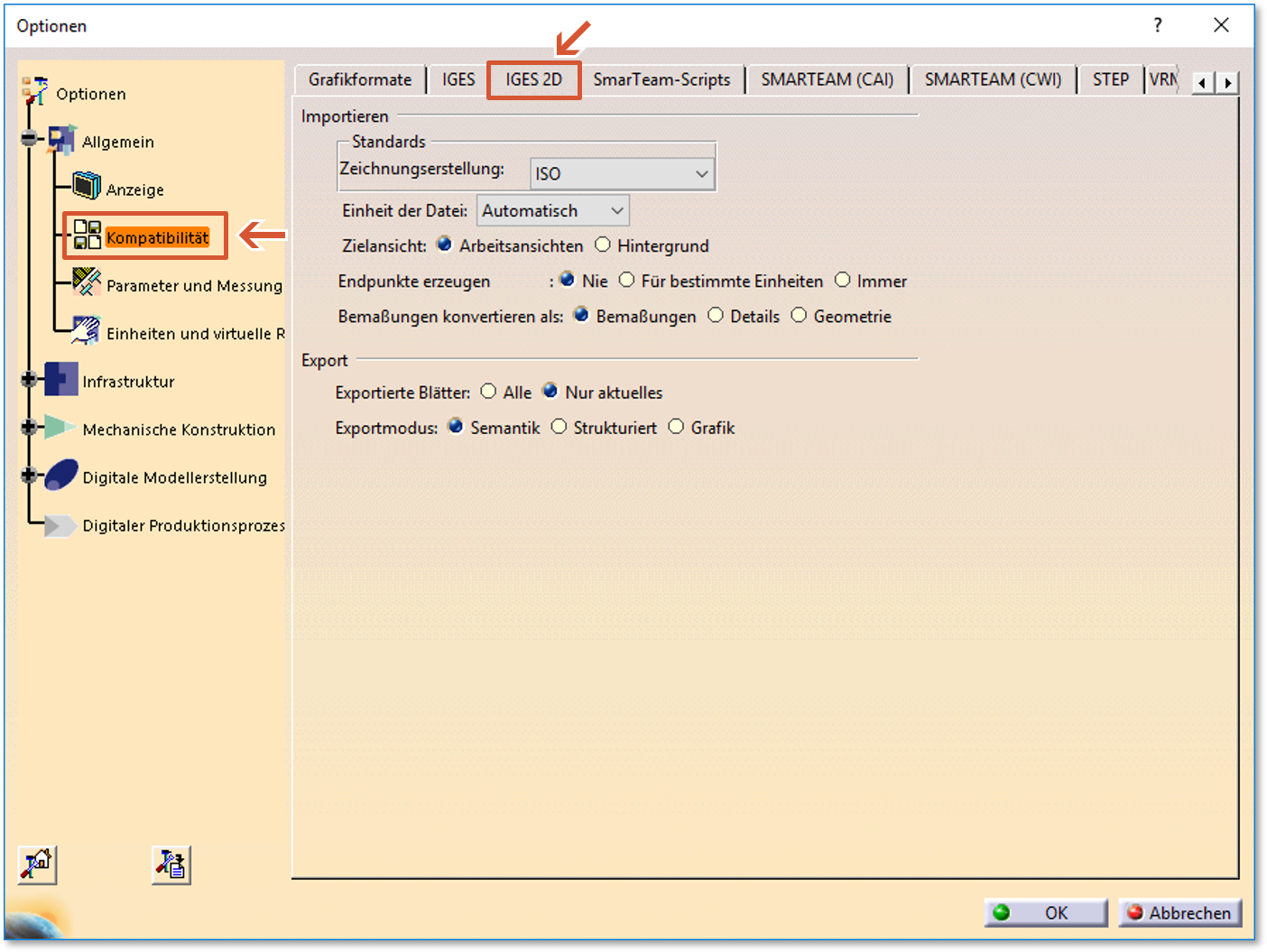 Exportoptionen Tools > Optionen > Allgemein > Kompatibilität > IGES 2D > Exportieren
