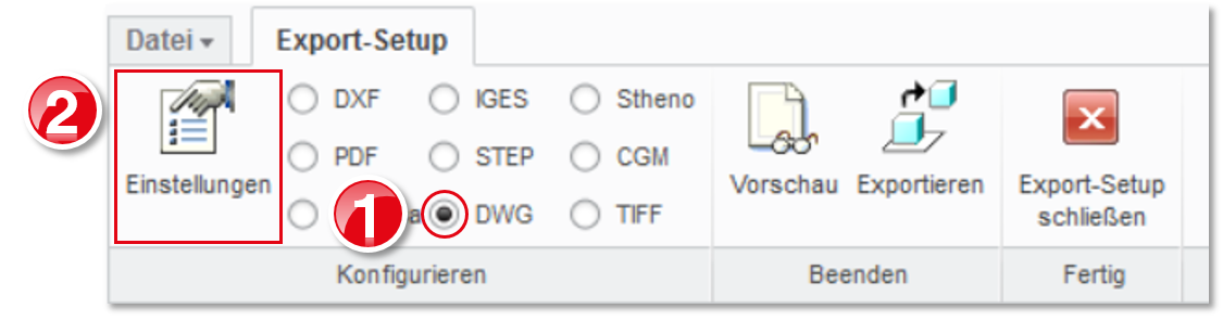 2 Menü Export­ein­stel­lun­gen öffnen Wählen Sie DWG aus und klicken Sie auf Einstellungen.