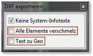 | Exportoptionen | Speichern unter > DXF(Dateityp) oder DWG (Dateityp) > Optionen └ Alle Elemente verschmelzen: Nein └ Text zu Geo: Nein Version 20.0: ![]() |