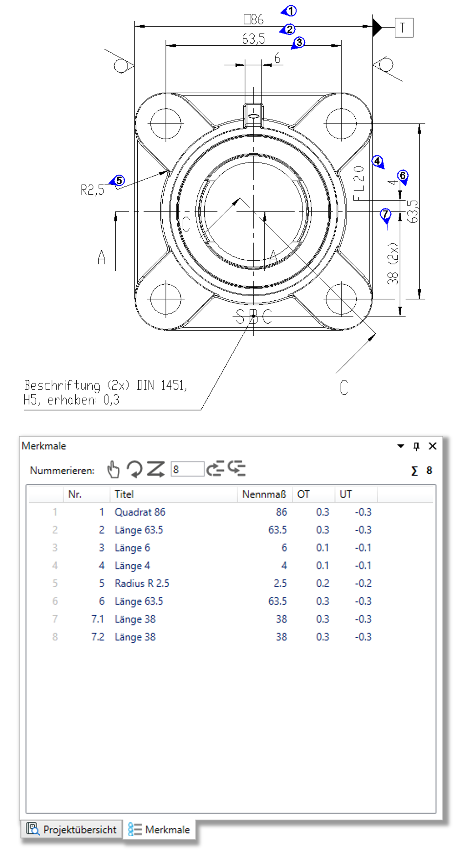 | 4a | Einzelnes Merkmal stempeln | Bewegen Sie den Mauszeiger ( | Im Beispiel wurde das Maß „□86“ in der gestempelt. Nach dem Stempeln hat es einen Stempel mit der Nummer „1“ erhalten und erscheint als Eintrag in der Merkmalübersicht: |