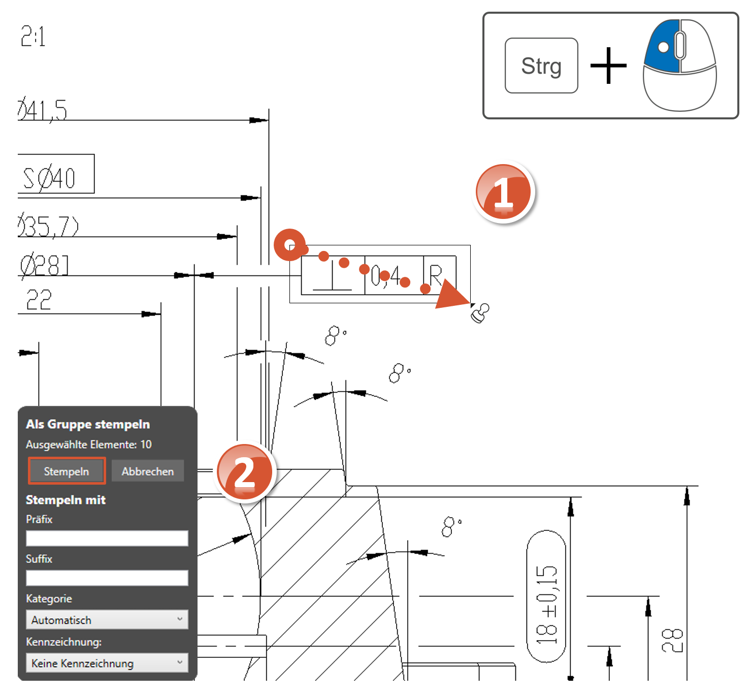 | 4c | Gruppe stempeln | 1) Bewegen Sie den Mauszeiger ( Im Beispiel wird der Zeichnungseintrag „Geometrische Toleranz“, angegeben mit einem Toleranzindikator (Toleranzrahmen), gestempelt: | 1) Im Dialog „Als Gruppe stempeln“ wird zur Kontrolle die Anzahl der erkannten Elemente angezeigt, im Beispiel sind es zehn. Dabei handelt es sich um die Vektor- und Textelemente, aus welchem der Zeichnungseintrag aufgebaut ist. |