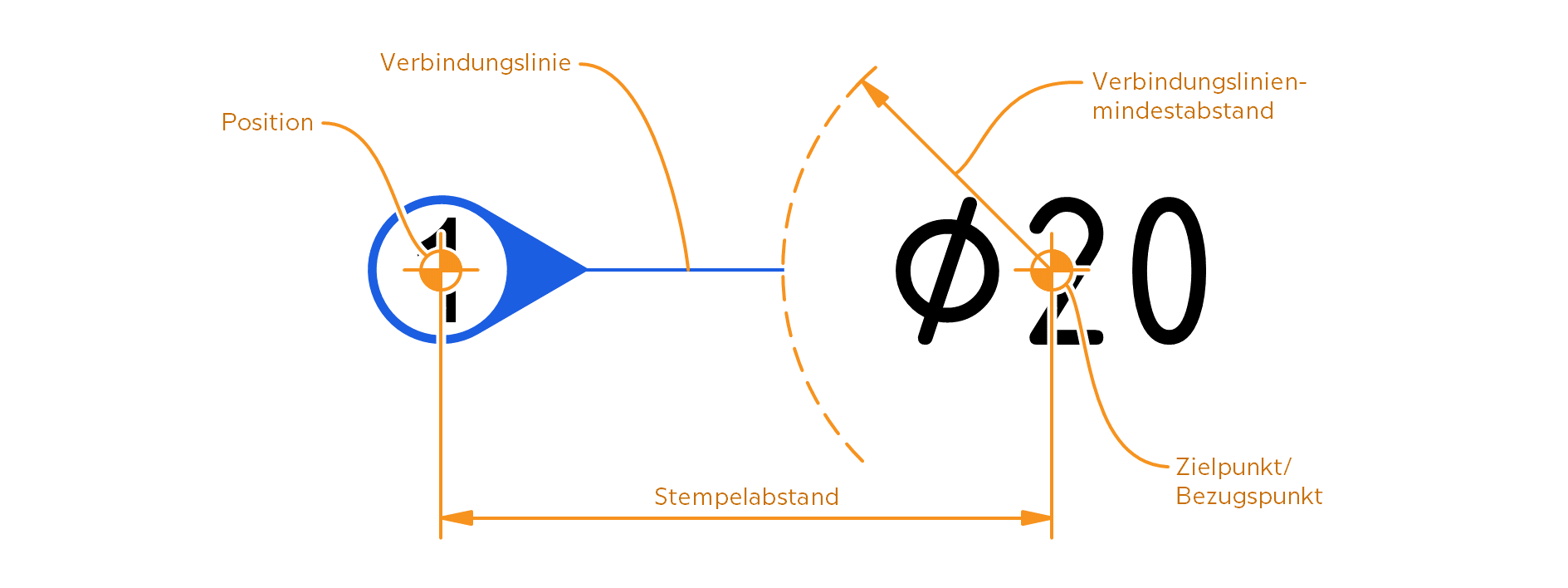 Beide Punkte können verschoben werden. Beim Verschieben der Stempelposition richtet sich der Stempel zum Bezugspunkt hin aus.