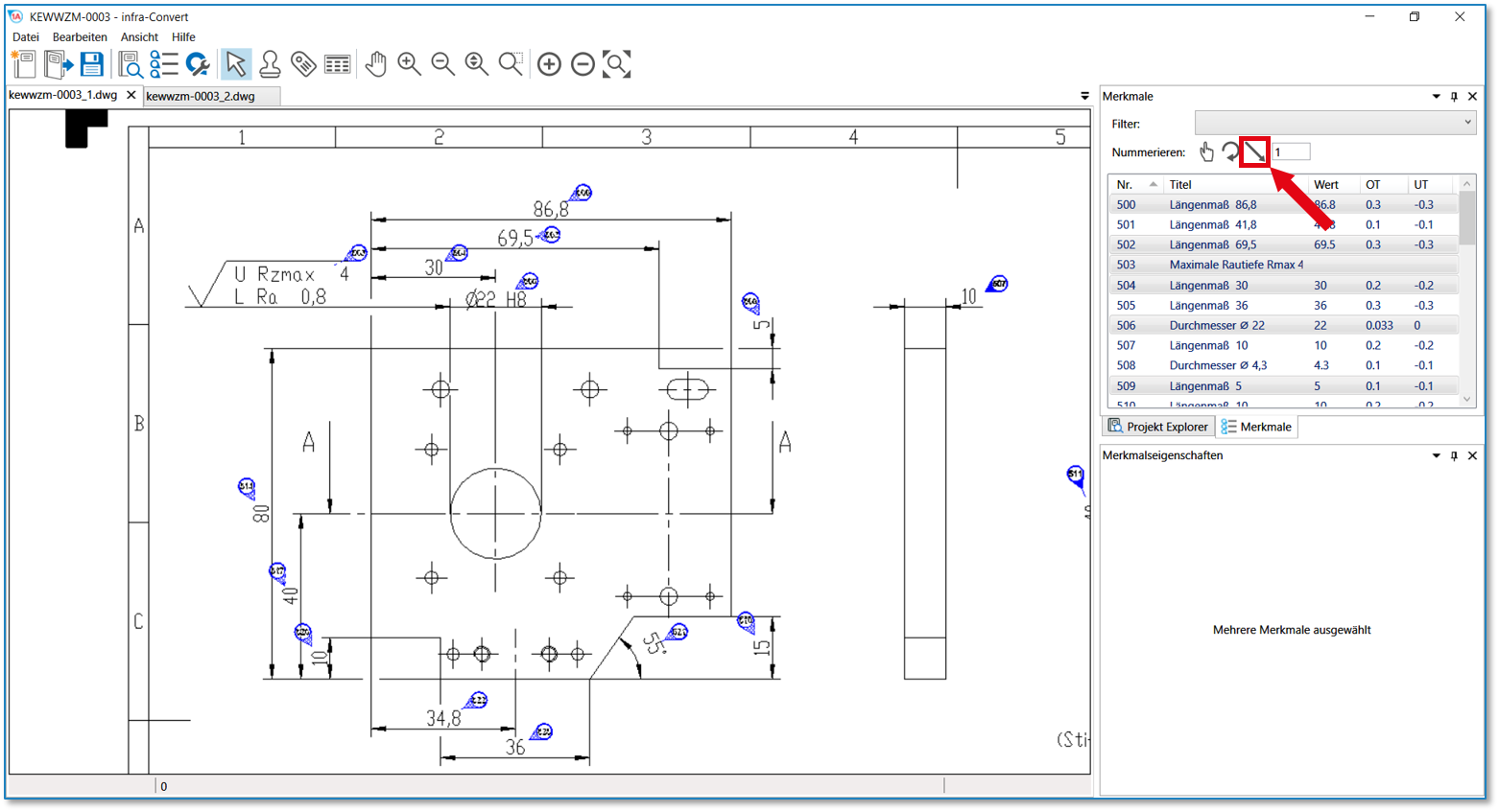 3) Sie können nun weitere Merkmale abklicken oder die Funktion „Manuell nummerieren“ verlassen, indem Sie in der Werkzeugleiste auf die Schaltfläche Auswahl-Werkzeug klicken oder die Tastaturtaste ESC drücken. 3) Ggf. sind weitere Merkmale neu nummeriert. Die Funktion „Manuell nummerieren“ ist nun nicht mehr aktiv.