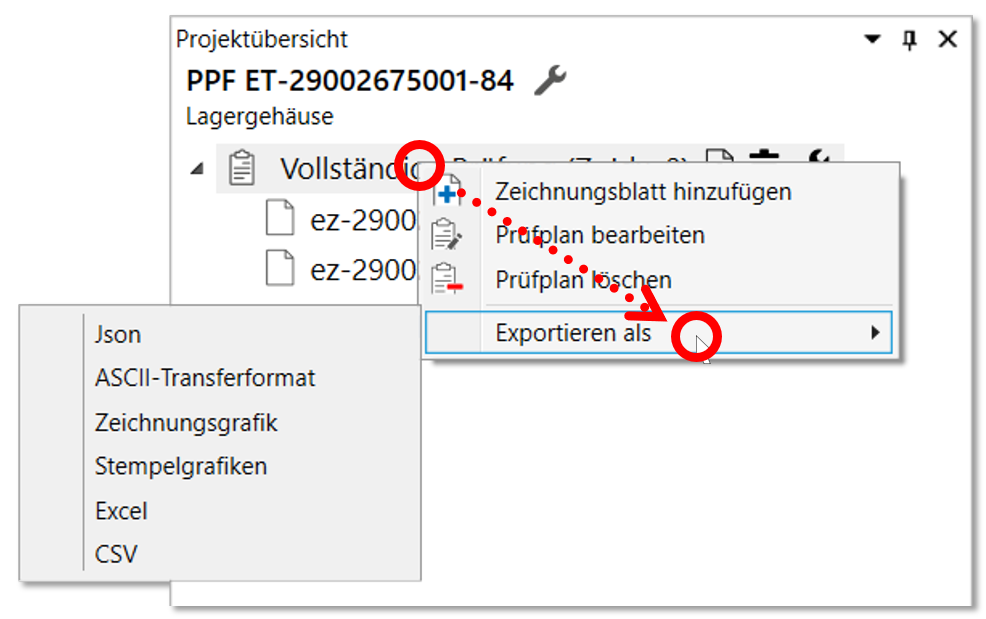 Klicken Sie in der Projektübersicht mit der rechten Maustaste auf die zu exportierende Prüfplanversion und gehen Sie mit dem Mauszeiger dann im sich öffnenden Kontextmenü auf den Listeneintrag Exportieren als.