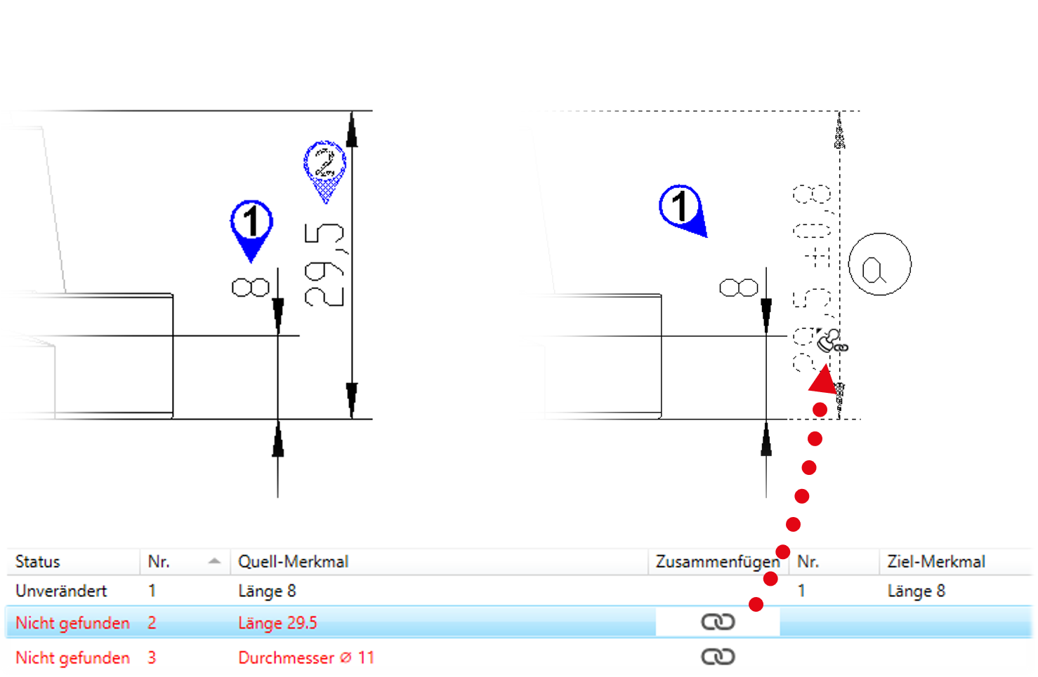 | 5 | Veränderte Merkmale zusammenfügen | 1) Gehen Sie die Merkmalliste durch. Merkmale, deren Wert sich verändert hat, die als Gruppe gestempelt werden müssen oder erst nach dem Zerlegen eines Textblocks gestempelt werden können, können nun manuell zusammengefügt werden. Klicken Sie dafür in der jeweiligen Zeile auf die Schaltfläche Zusammenfügen Im Beispiel soll das Merkmal Nr. 4, dessen Passungsangabe sich von „H8“ auf „H7“ geändert hat, durch Zusammenfügen in die neue Prüfplanversion übernommen werden: | 1) Die Stempelfunktion ist aktiv. Der Mauszeiger wandelt sich zum Stempel-Symbol |