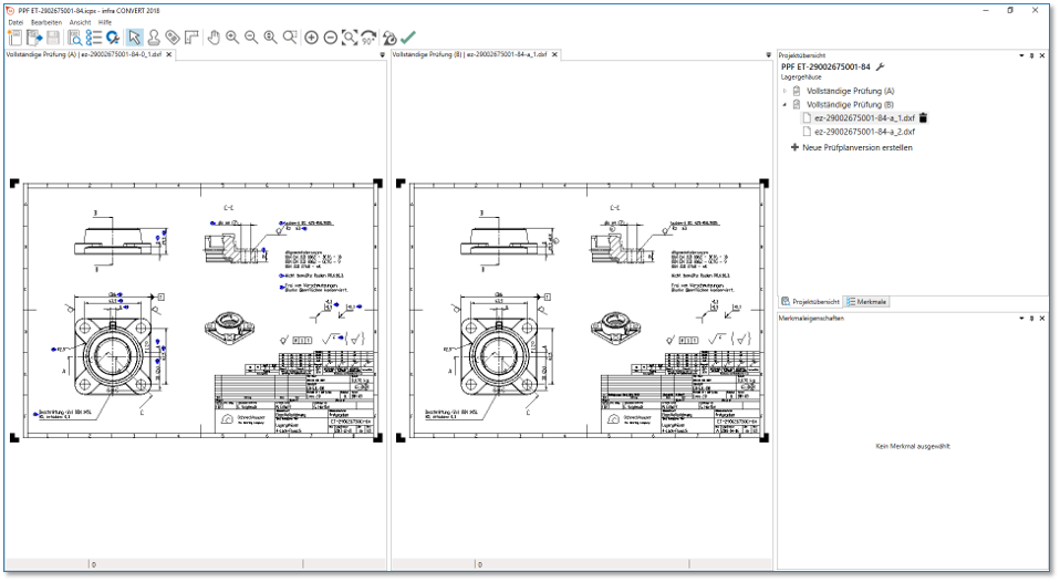 | 3 | Merkmale übertragen | Klicken Sie im Funktionsfenster in der Werkzeugleiste auf die Schaltfläche Merkmale übertragen ( | Alle Merkmale, auf die nicht eine der folgenden Kriterien zutreffen, werden übertragen. Merkmale, die - sich in einer Eigenschaft geändert haben, - nicht mehr vorhanden sind, - aus Textblöcken extrahiert - als Gruppe gestempelt werden müssen oder - manuell eingefügt wurden, werden nicht übertragen. |