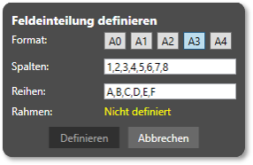 2 Einteilung anpassen Passen Sie gegebenenfalls die Kennzeichen für Spalten und Reihen an. Buchstaben und Zahlen, auch mehrstellig, werden durch ein Komma getrennt in die Felder eingetragen. Die Feldeinteilungen für die Formate DIN A0 bis DIN A4 können per Schaltfläche gewählt werden (verfügbar ab Programmversion 1.2.0.30; gemäß DIN EN ISO 5457:2010-12). Die Kennzeichen der Feldeinteilung sind definiert.