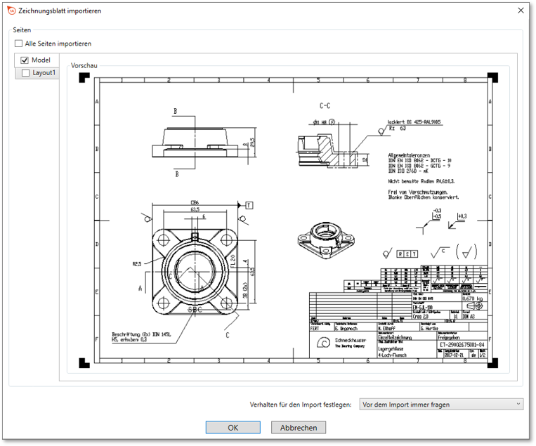 | 2 | Zeichnungsblätter auswählen | Navigieren Sie zum Speicherort der Zeichnungsblätter und laden Sie diese (Verzeichniseintrag doppelklicken oder Eintrag oder mehrere Einträge auswählen und auf Öffnen klicken). Hinweis IGES-Dateien können nur mit einer Lizenz für das Zusatzmodul „IGES“ geladen werden. | [A] Abhängig vom Dateiformat (*.dxf, *.dwg) und gesetzter Voreinstellung öffnet sich der Dialog „Zeichnungsblatt importieren“, andernfalls werden die Zeichnungsblätter wie unter C) beschrieben direkt hinzugefügt:![]() Anmerkung Die Funktion zur Auswahl von Modell- und Papierbereichen ist nur in der Pro-Version und erst ab Programmversion 1.4.0.5 verfügbar. |