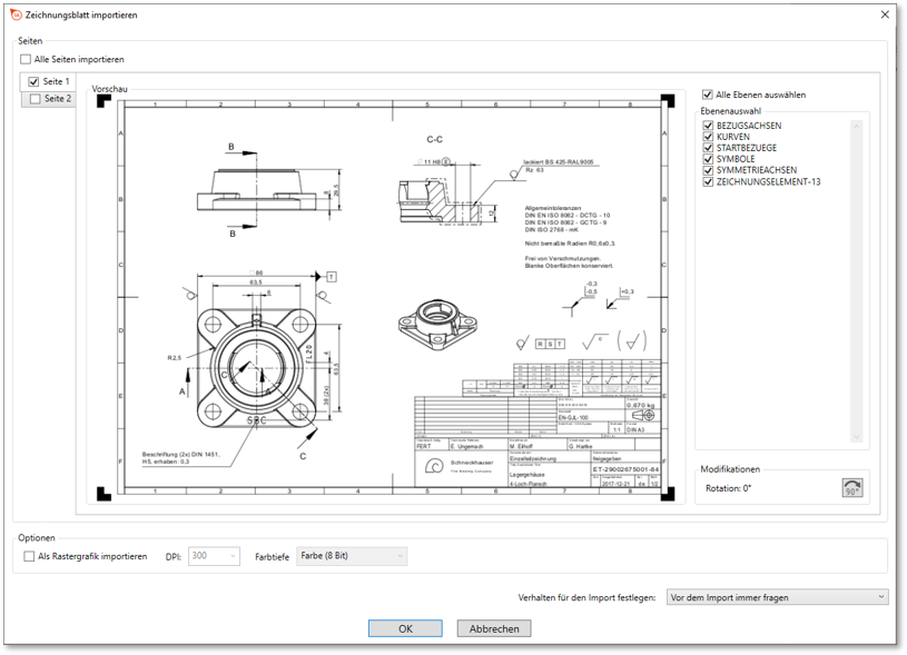 [B] Abhängig vom Dateiformat (*.pdf) und gesetzter Voreinstellung öffnet sich der Dialog „Zeichnungsblatt importieren“, andernfalls werden die Zeichnungsblätter wie unter C) beschrieben direkt hinzugefügt:![]() Anmerkung Die im Dialog angezeigte Option ist ab Programmversion 1.4.0.5 verfügbar |
