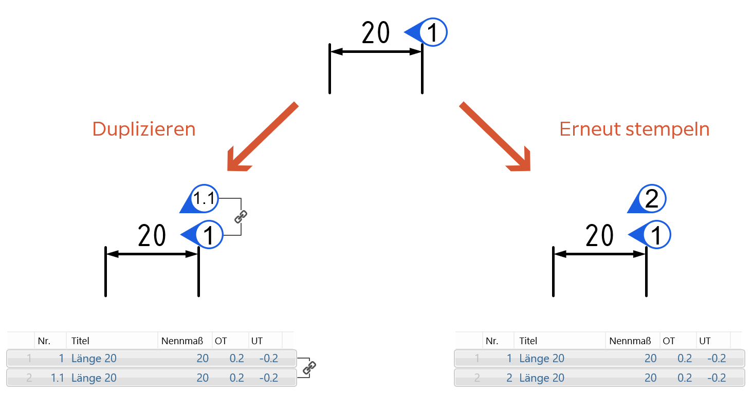 Mit den beiden Funktionen Duplizieren und Erneut stempeln können Sie Kopien eines Merkmals mit eigenem Stempel erstellen. Es wird ein Merkmal mit den gleichen Eigenschaften erzeugt, welche anschließend unabhängig voneinander bearbeitet werden können (anders als beim Arbeiten mit der Merkmaleigenschaft „Wiederholungen“, siehe Hinweis unten). Duplizierte Merkmale bleiben über die Stempelnummer miteinander verbunden, die Stempelnummer wird mit einem Index („.1“, „.2“ etc.) versehen und beim Neu-Nummerieren als Gruppe behandelt. Zudem wird in den Merkmaleigenschaften angezeigt, dass es sich um ein dupliziertes Merkmal handelt. Ein durch erneutes Stempeln erzeugtes Merkmal ist vollkommen unabhängig vom Ursprungsmerkmal.