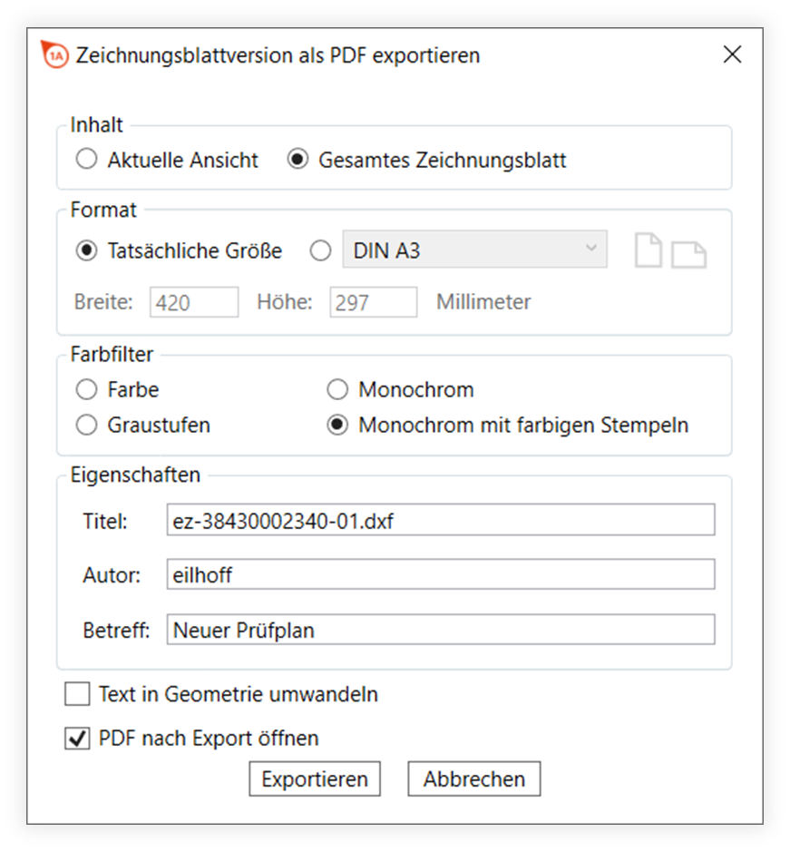 | 3 | Zeichnung exportieren | Klicken Sie unten im Dialogfenster auf Exportieren. | Das Zeichnungsblatt wurde exportiert und am angegebenen Ort gespeichert. |