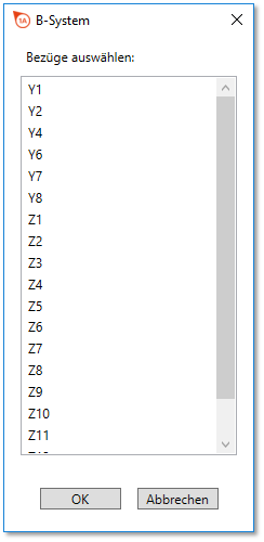 2 Bezüge zuweisen 1) Neben dem Feld „B-System“ auf die Schaltfläche klicken. 1) Es öffnet sich das Dialogfenster „B-System“, in welchem alle auf dem Zeichnungsblatt gefundenen Bezugskennzeichen aufgelistet werden: