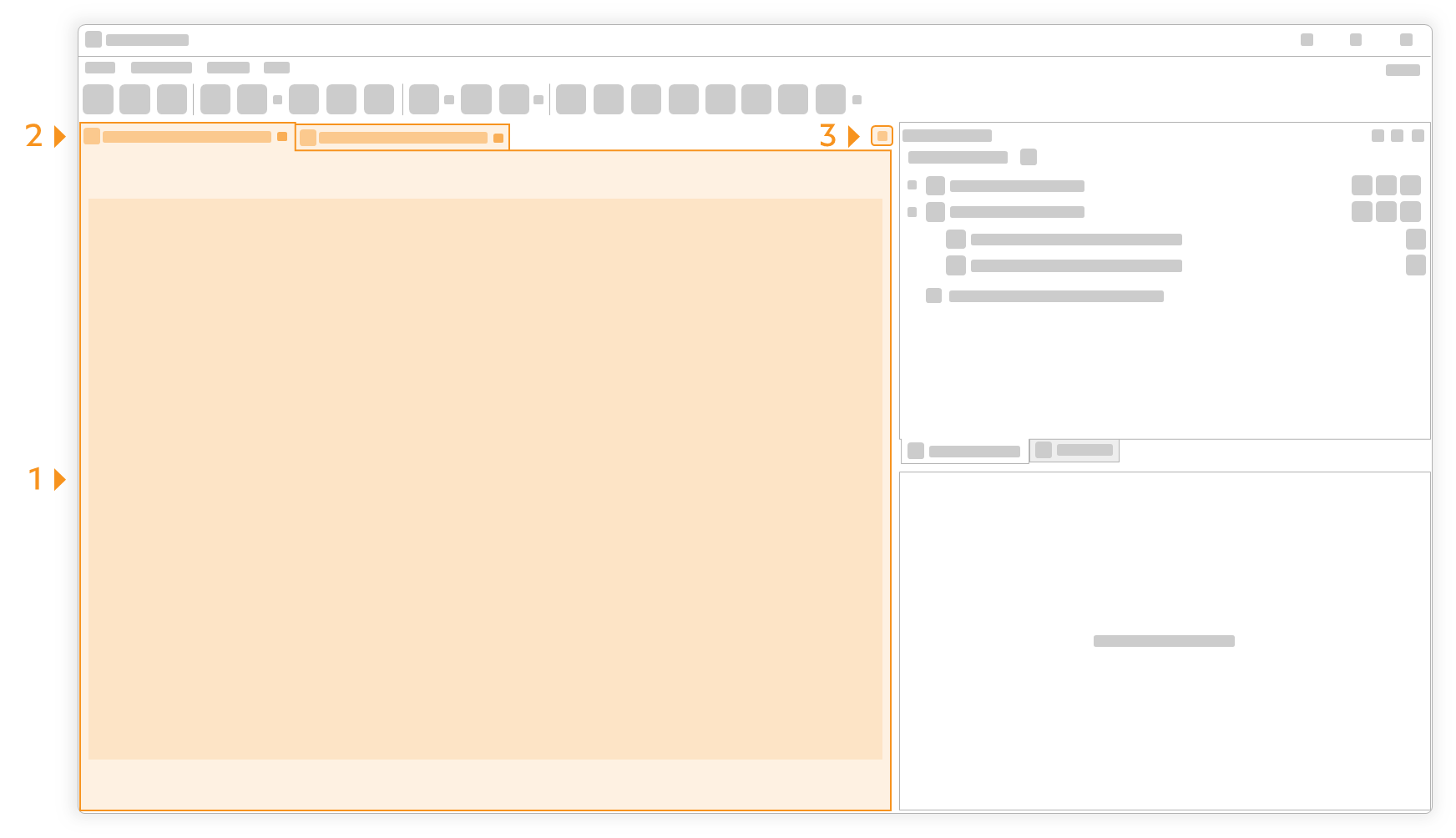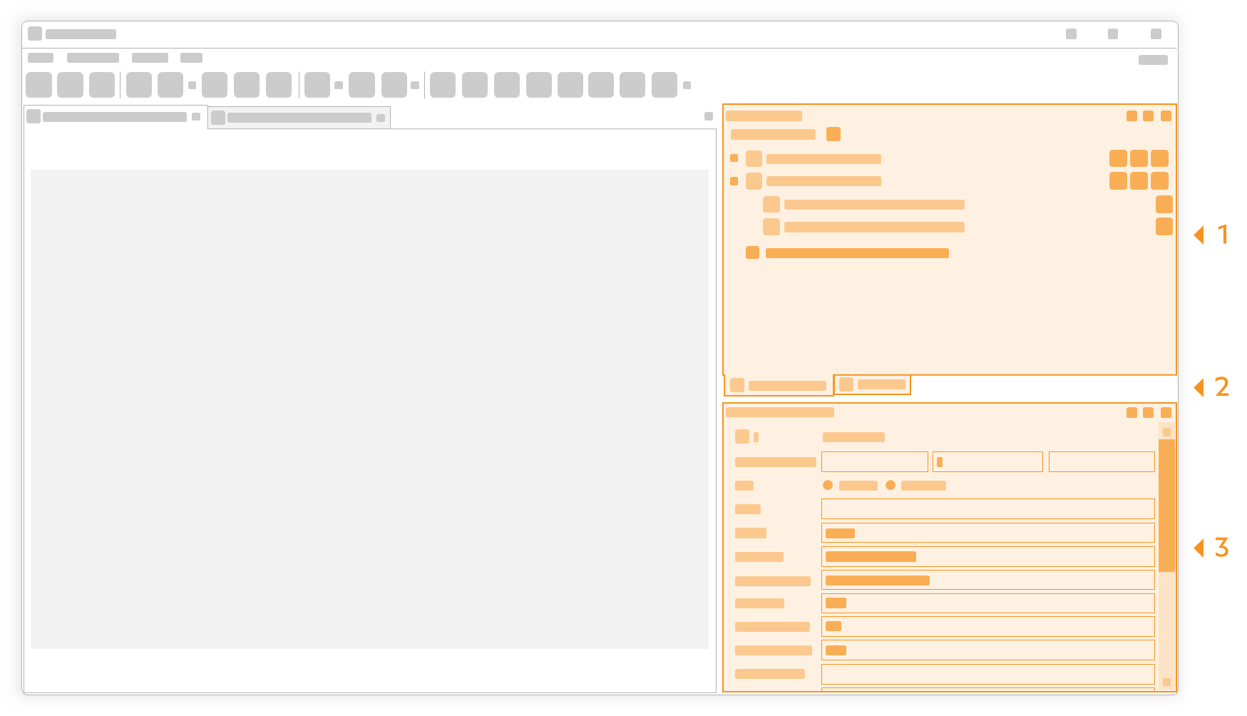 Funktionsfenster werden standardmäßig in zwei Gruppen rechts im Hauptfenster dargestellt. Über die unten angeordneten Tabs kann zwischen den Registerkarten gewechselt werden.