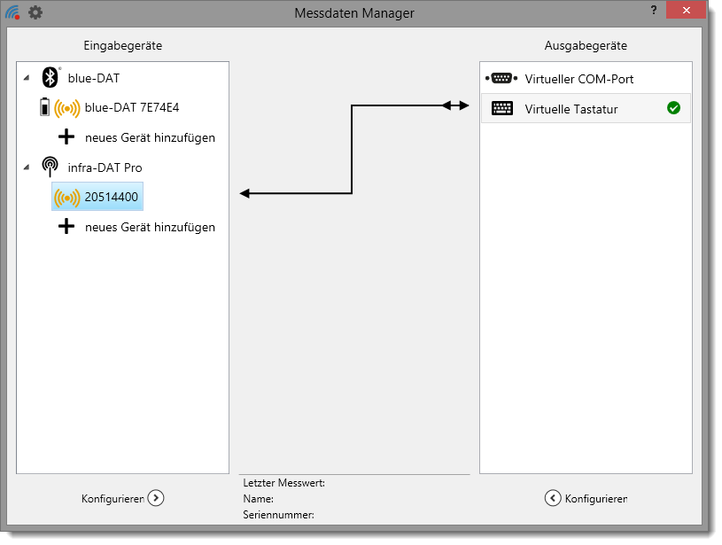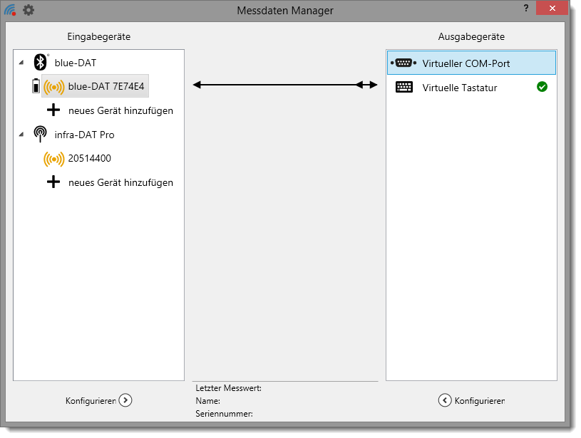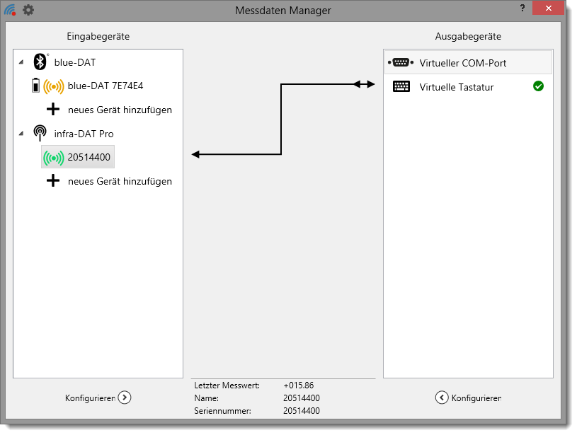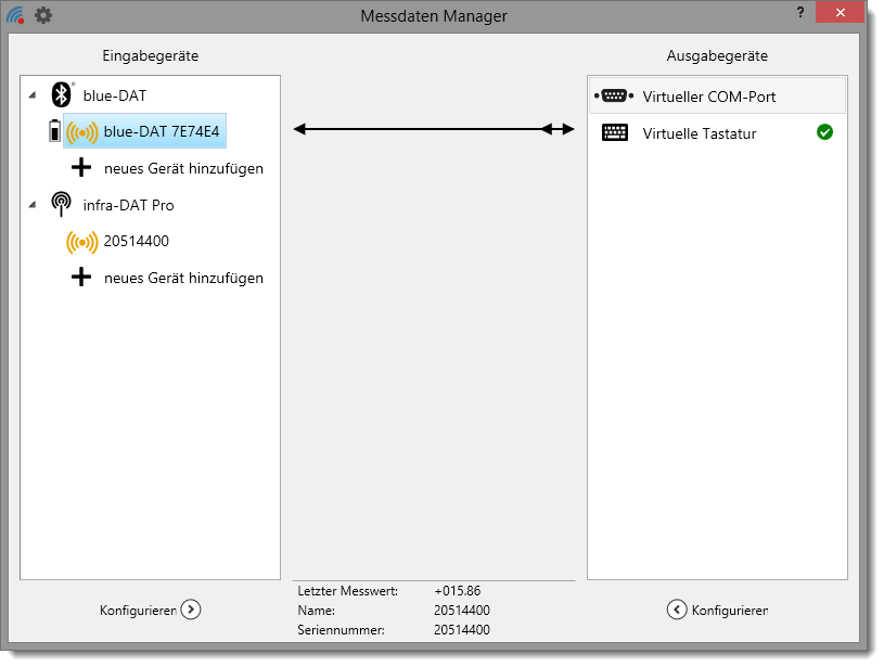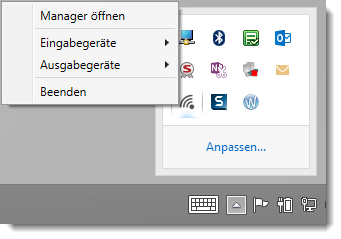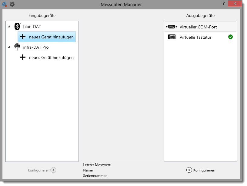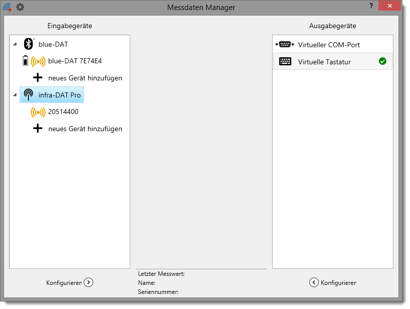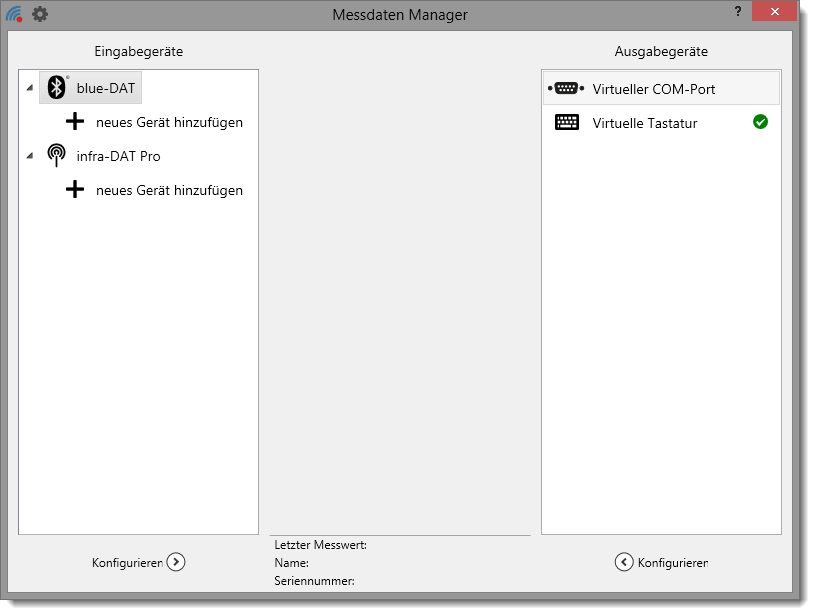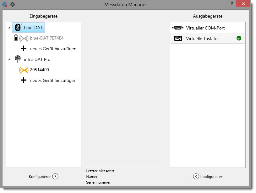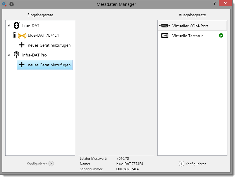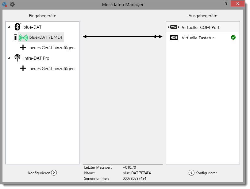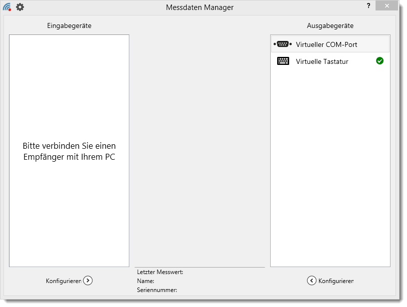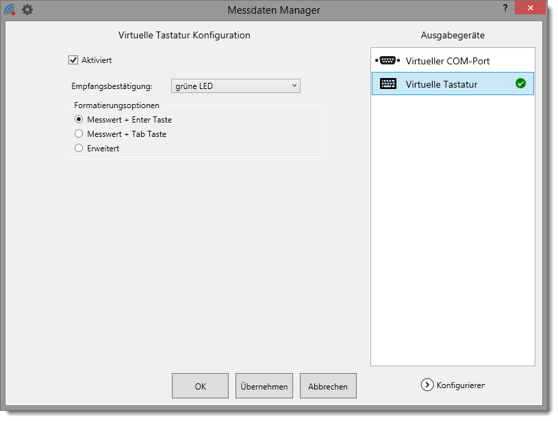 In der Liste Ausgabegeräte werden die Schnittstellen Virtueller COM-Port und Virtuelle Tastatur angezeigt. Als Standardausgabe steht nach der Installation die Virtuelle Tastatur zu Verfügung. Dieses erkennen Sie an dem grün hinterlegten Häkchen. Die Daten werden hierbei so weitergegeben als hätten Sie diese über die Tastatur eingegeben. Sie können das Fenster schließen, die Software läuft im Hintergrund weiter. Um das Fenster erneut zu öffnen, wählen Sie das Messdaten Manager Symbol in der Taskleiste mit der rechten Maustaste aus und klicken dann mit der linken Maustaste auf Manager öffnen. Um mdm TOOL zu beenden klicken Sie auf Beenden.
