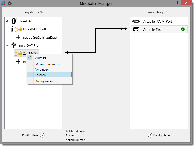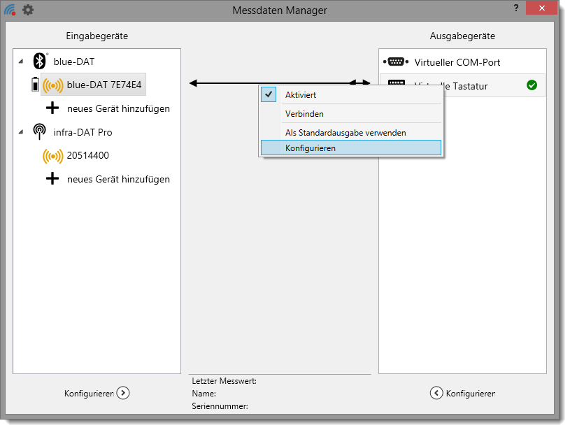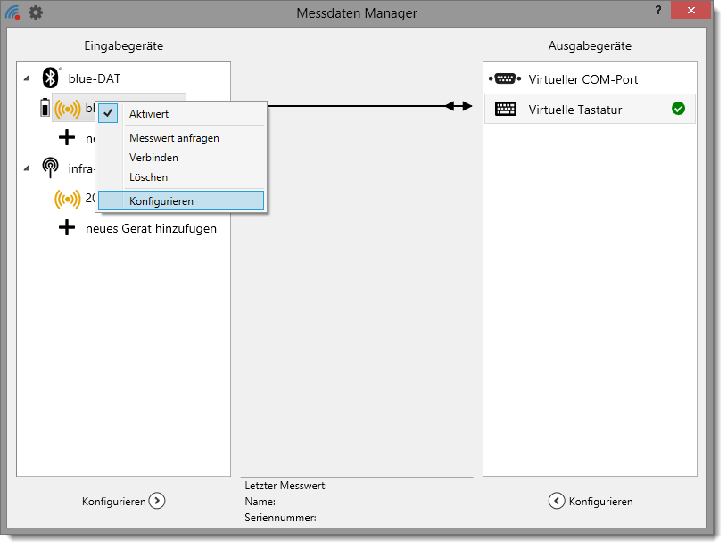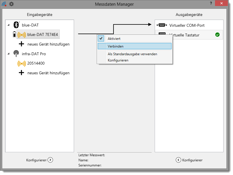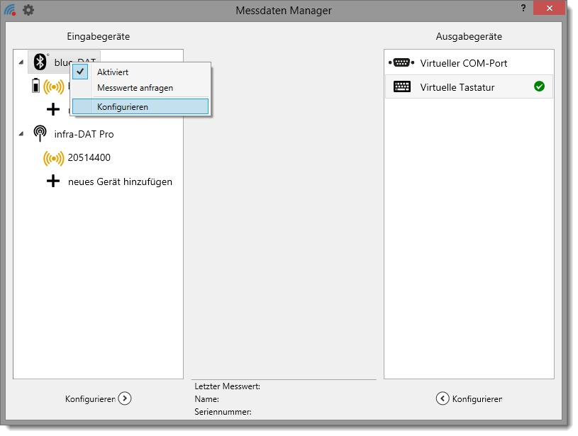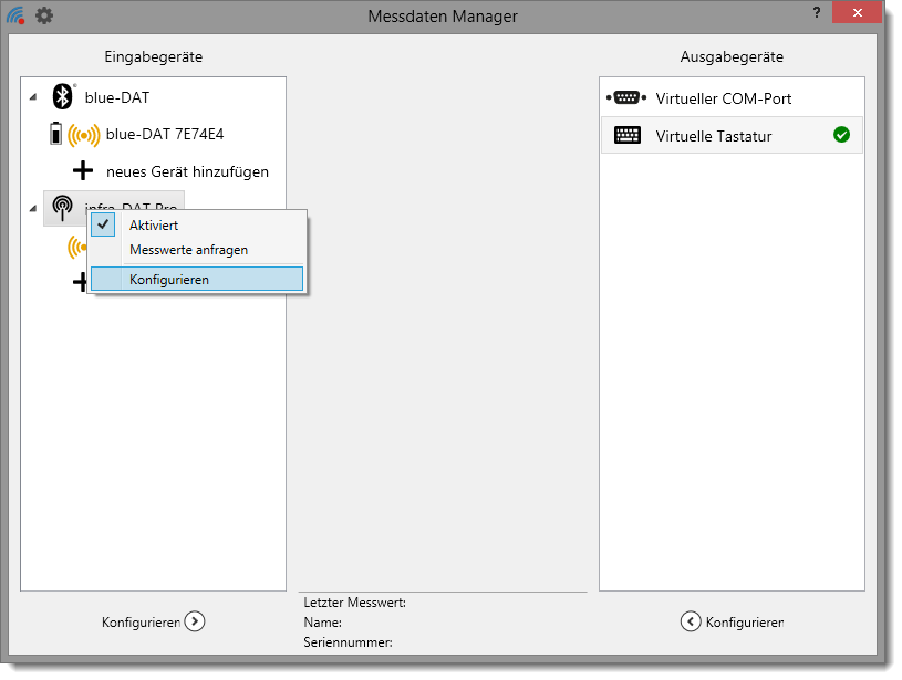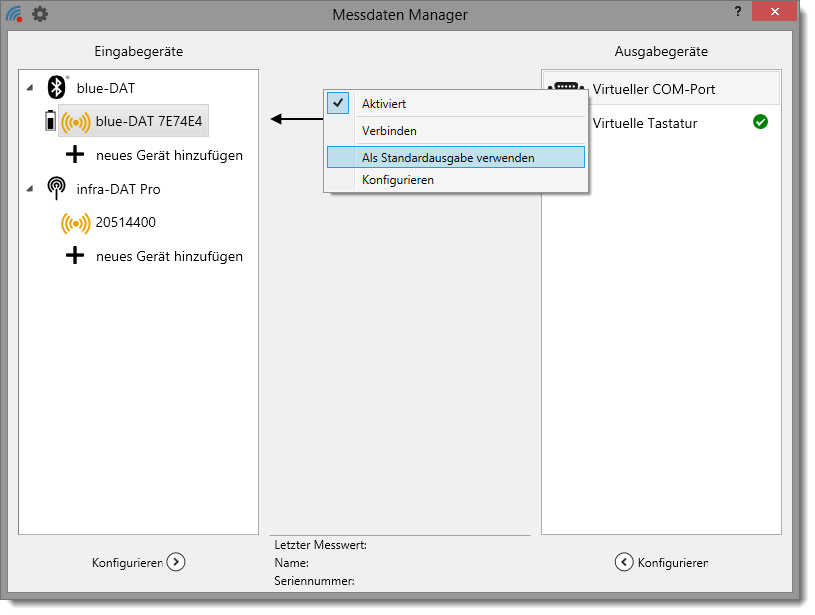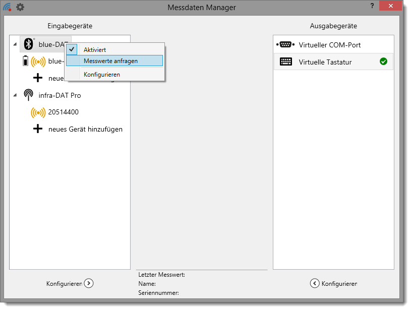 Zum Anfragen eines Messwertes von einem Eingabegerät wählen dieses per Mausklick aus der Liste aus und öffnen danach mit der rechten Maustaste das Kontextmenü. Klicken Sie im Kontextmenü auf den Eintrag Messwert anfragen.