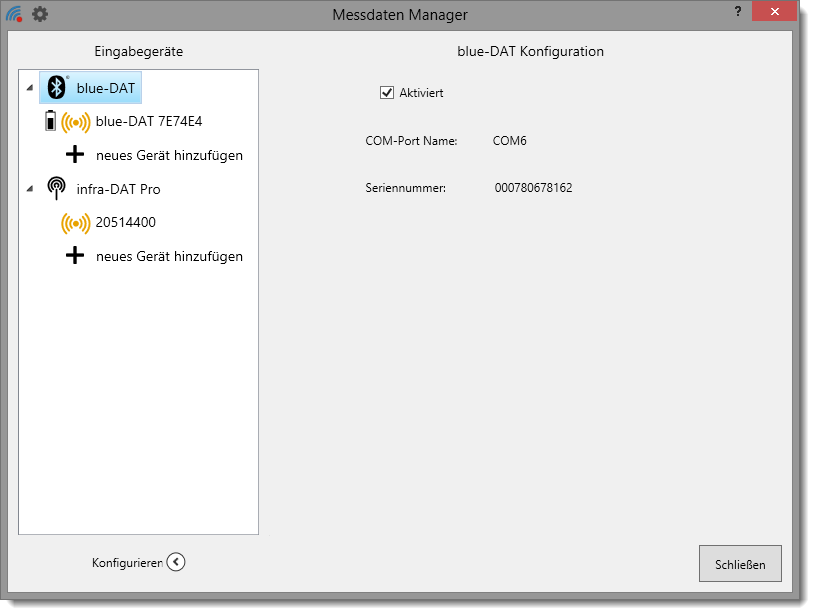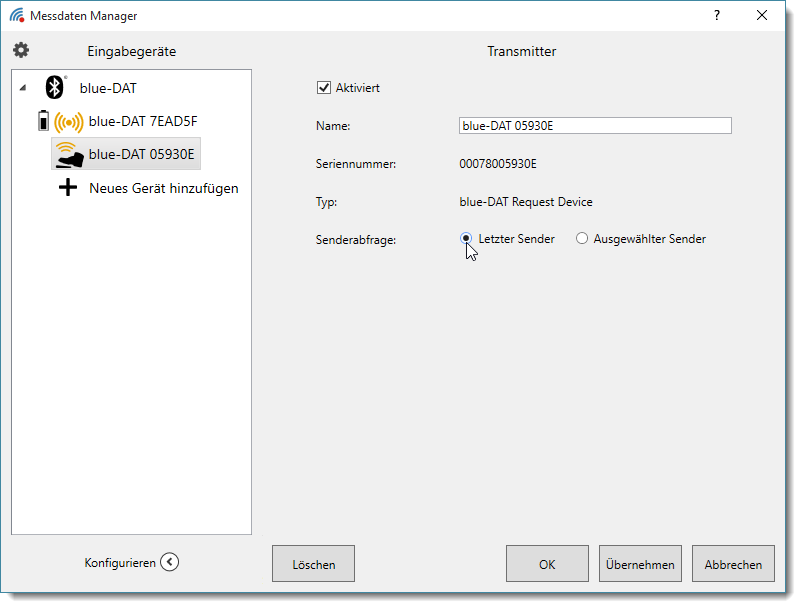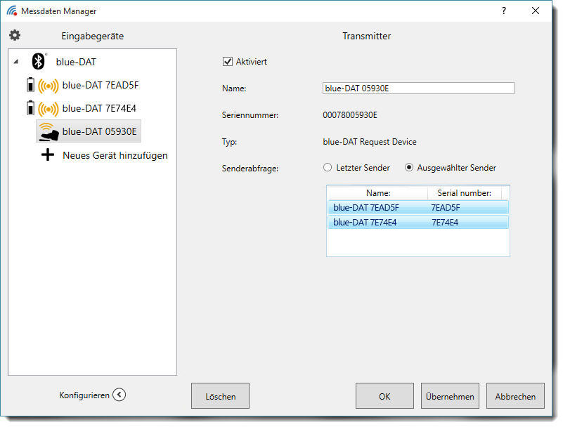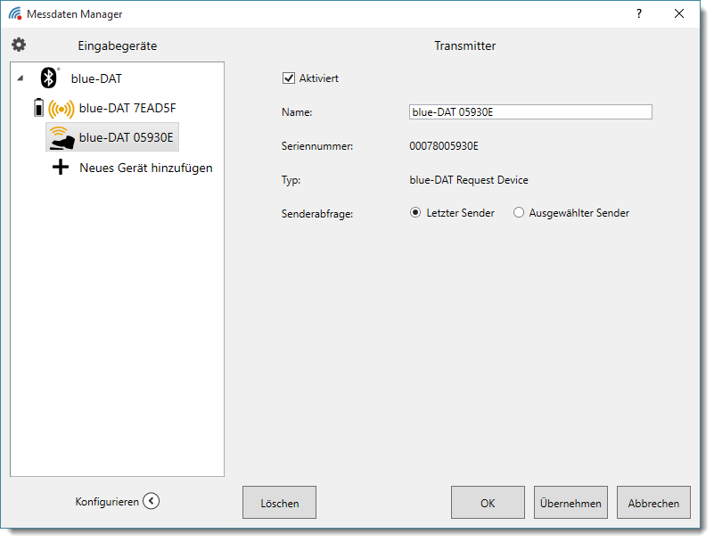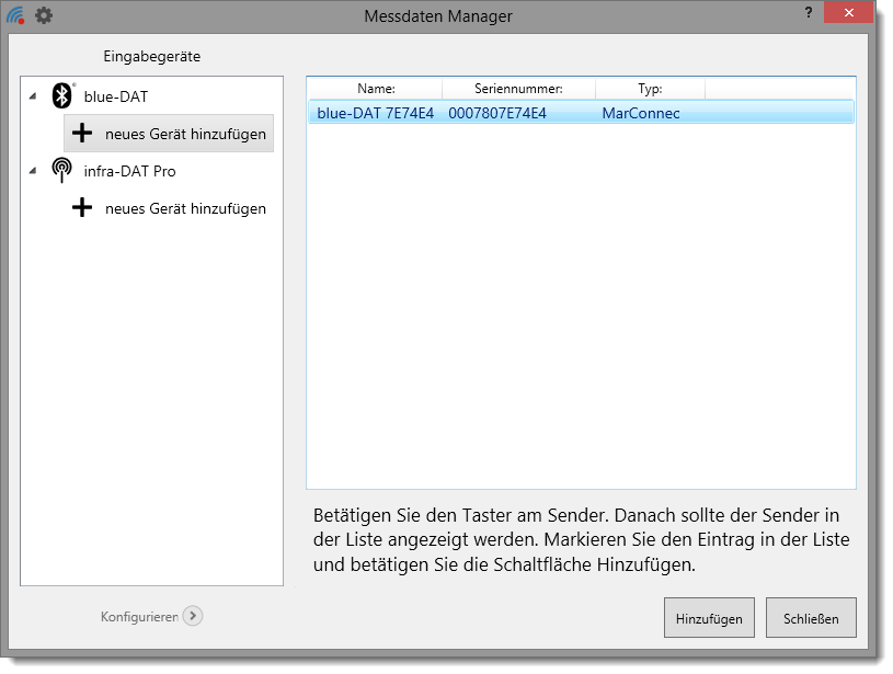 Öffnen Sie durch einen Doppelklick auf den Platzhalter + neues Gerät hinzufügen im Listenbereich blue-DAT die Geräteliste. In der Geräteliste sind alle Sender aufgelistet, die erkannt wurden. Ausgeschaltete Sender werden nicht erkannt. Um den Sender einzuschalten, drücken Sie kurz auf die Taste am Sender. Der Sender wird nun in der Liste angezeigt und die blaue LED am Sender leuchtet.