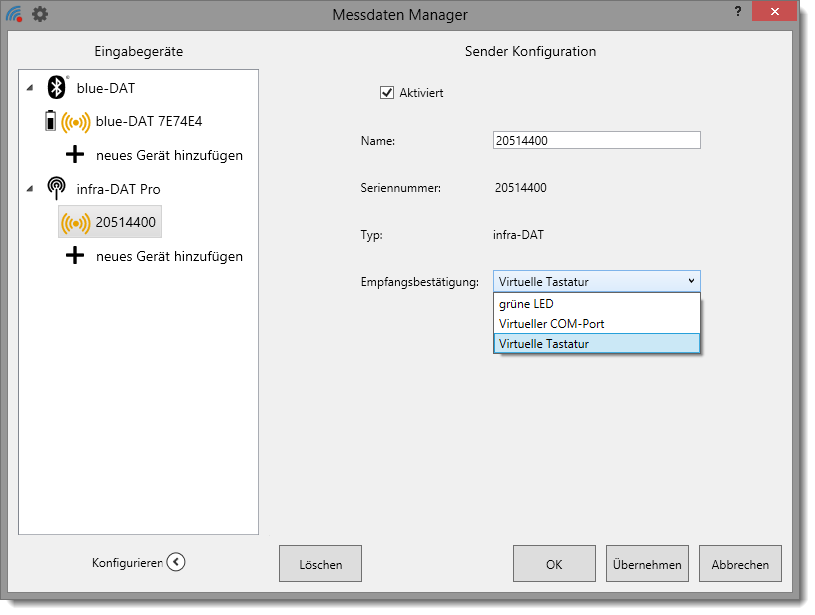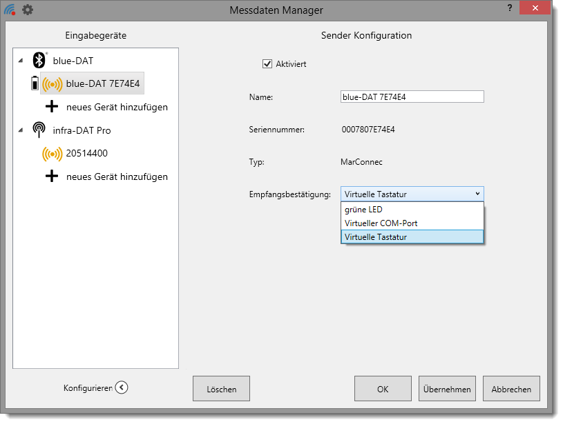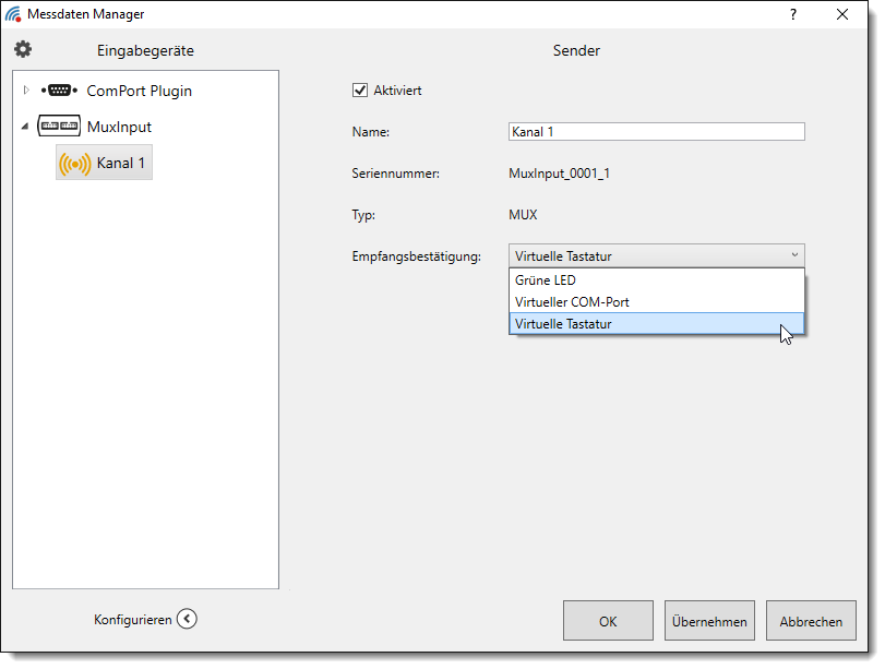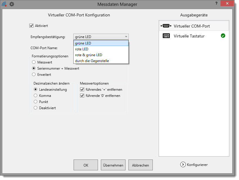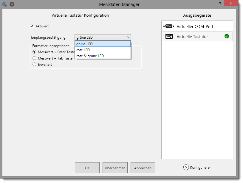 Im Auswahlfeld Empfangsbestätigung geben Sie an, von welchem Ausgabegerät Sie die Empfangsbestätigung für Ihren Messwert erwarten. Wenn Sie den Listeneintrag grüne LED auswählen, wird nach der Verarbeitung des Messwertes die grüne LED am Sender eingeschaltet. Bei Auswahl des Listeneintrags Virtueller COM-Port oder Virtuelle Tastatur, wird die Bestätigung vom ausgewählten Ausgabegerät übernommen und die entsprechenden LEDs werden eingeschaltet.
