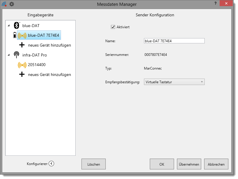 Haben Sie Ihre Empfänger, z. B einen blue DAT- und einen infra DAT-Empfänger, angeschlossen, werden diese unter der Liste Eingabegeräte angezeigt.
