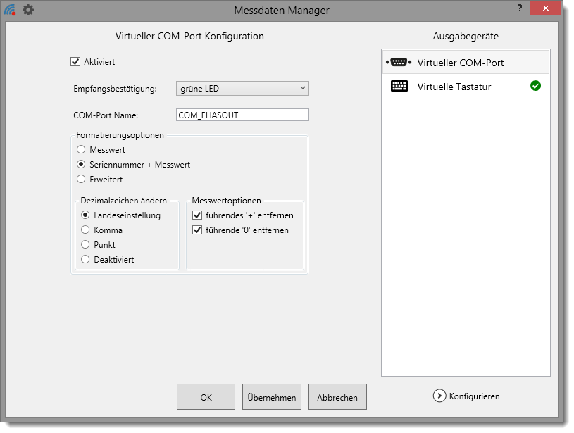 Im Konfigurationsfenster können Sie den virtuellen COM-Port mittels Check-Box Aktiviert deaktivieren oder aktivieren.
