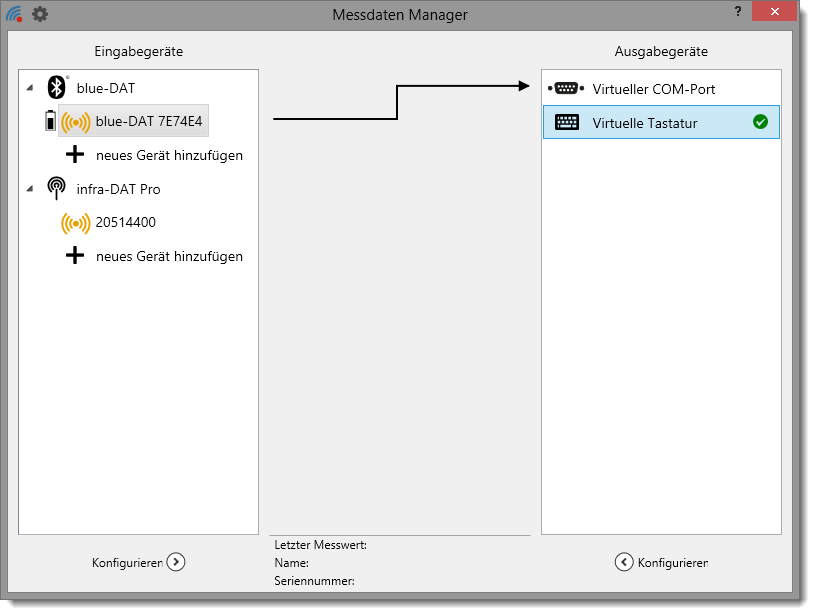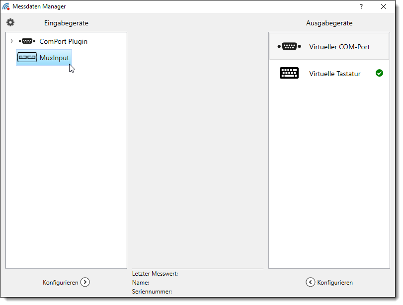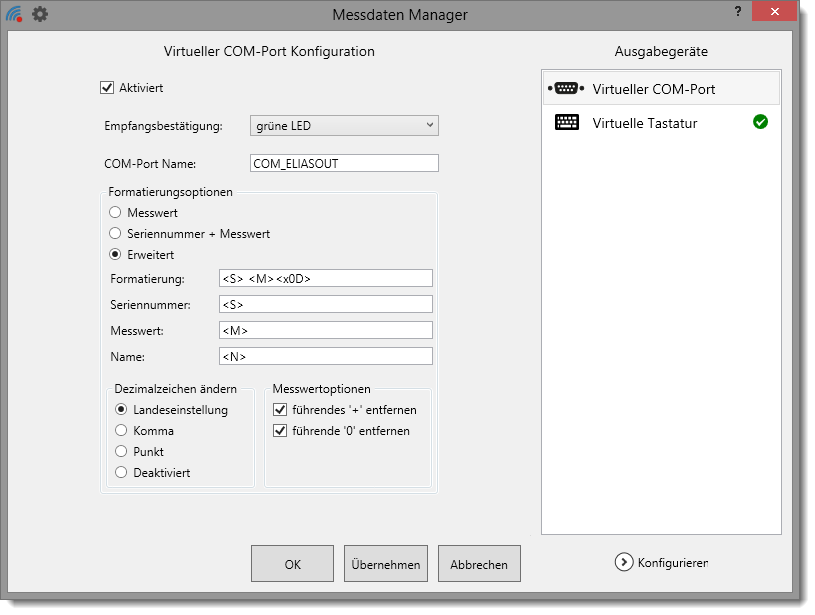 Als Ausgabegeräte stehen standardmäßig der virtuelle COM-Port und die virtuelle Tastaturschnittstelle zur Verfügung. Diese Ausgabegeräte können unterschiedlich konfiguriert werden.