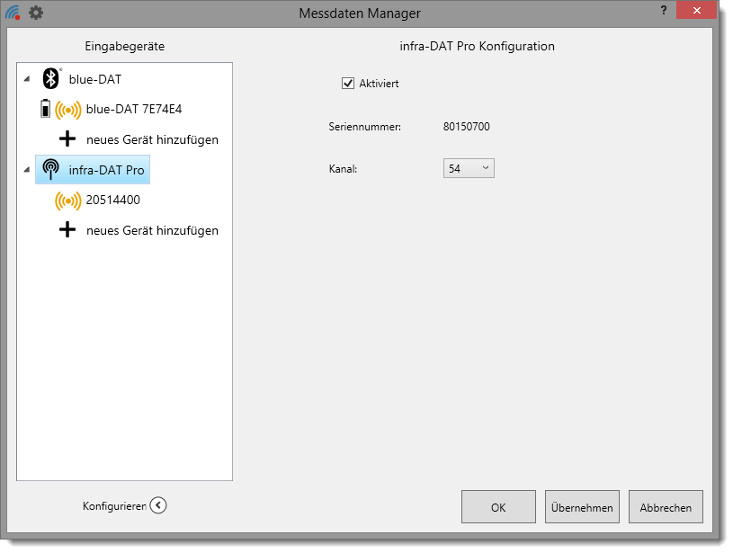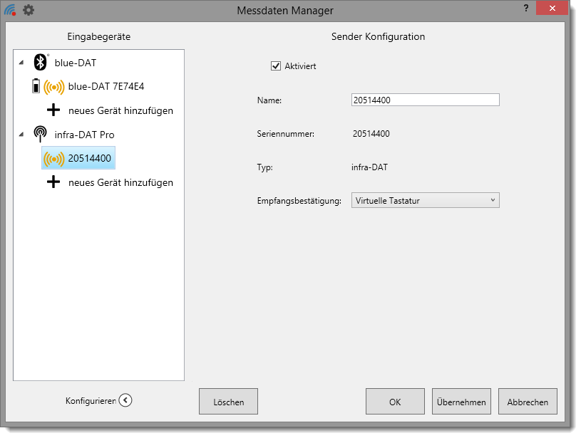 Im Konfigurationsfenster können Sie den infra DAT-Empfänger mittels Check-Box Aktiviert deaktivieren oder aktivieren.