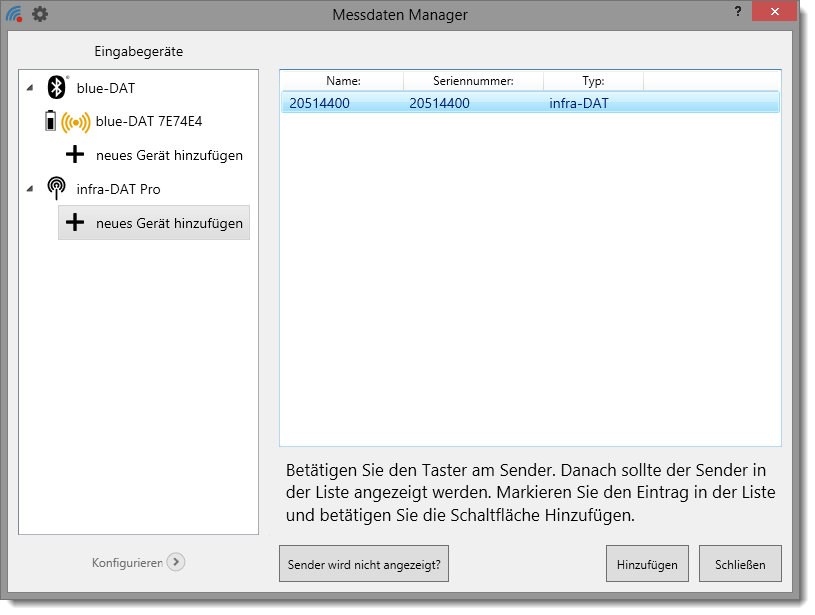 Öffnen Sie durch einen Doppelklick auf den Platzhalter + neues Gerät hinzufügen im Listenbereich infra-DAT die Geräteliste. In der Geräteliste sind alle Sender aufgelistet, die erkannt wurden. Ausgeschaltete Sender werden nicht erkannt. Um den Sender einzuschalten, drücken Sie kurz auf die Taste am Sender. Der Sender wird nun in der Liste angezeigt.
