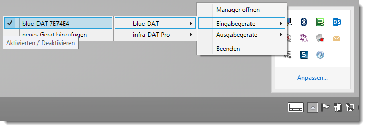 Alternativ können Sie Geräte über das Kontextmenü des mdm TOOL-Symbols in der Taskleiste aktivieren bzw. deaktivieren.