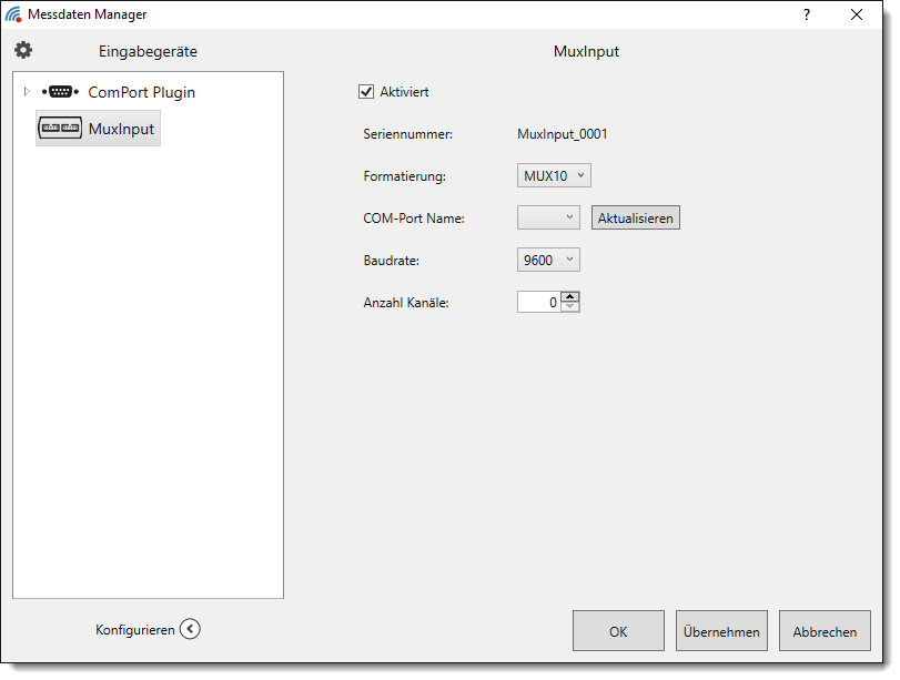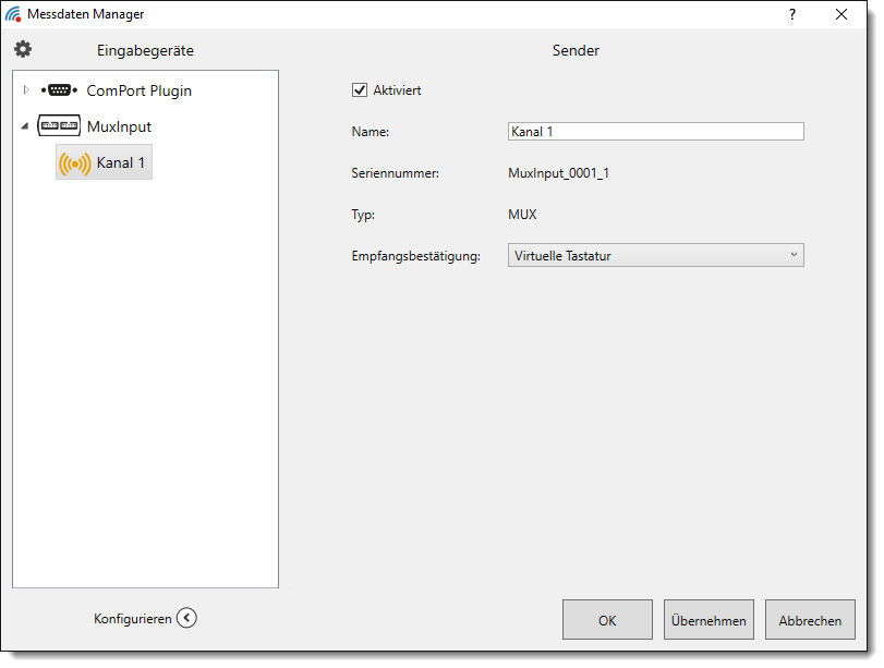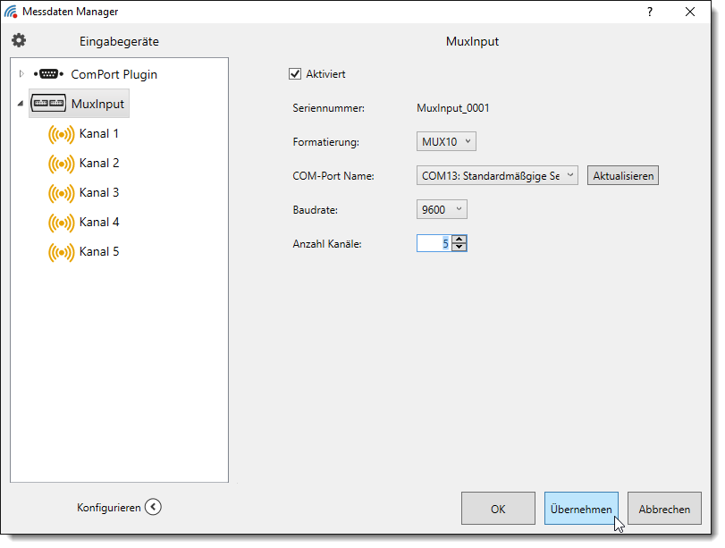 Wenn Sie Ihre Einstellungen mit OK oder Übernehmen bestätigen, wird automatisch eine entsprechende Anzahl Messmittel-Kanälen in der Liste der Eingabegeräte hinzugefügt.