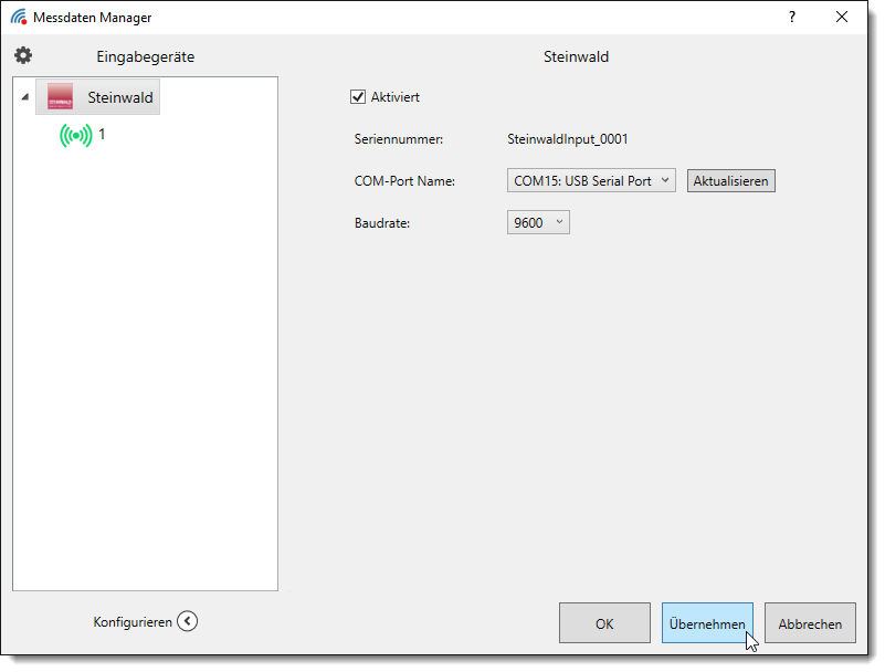 Im Eingabefeld Name können Sie eine Bezeichnung für das Messmittel eingeben. Diese wird dann in der Liste der Eingabegeräte angezeigt. Bei mehreren Messmitteln erhöht dies die Übersichtlichkeit der Liste.