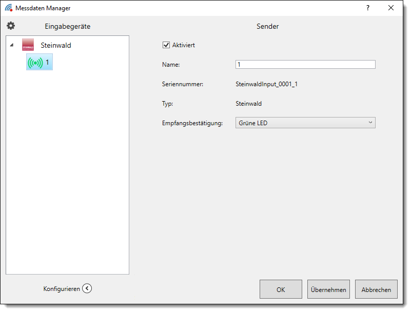 Im Eingabefeld Name können Sie eine Bezeichnung für den Sender eingeben. Diese wird dann in der Liste der Eingabegeräte angezeigt. Bei mehreren Sendern erhöht dies die Übersichtlichkeit der Liste.