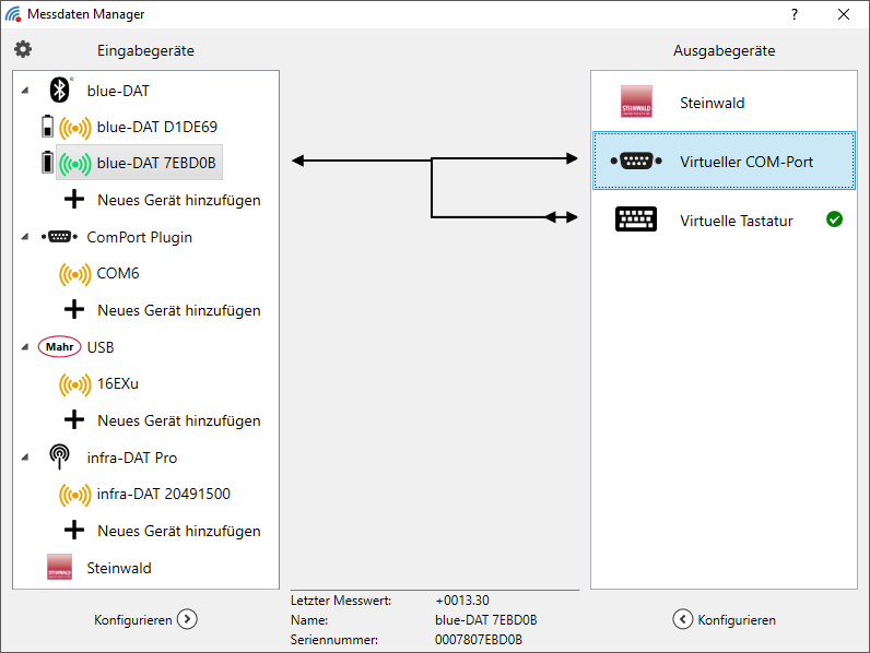 An der Geräteschnittstelle werden der digitale Messwert und Metadaten, wie die Messgeräte- oder Sender-ID oder der Batterieladestand, entgegengenommen und verarbeitet. Die individuell formatierten Messdaten, z. B. Messwert + Zeitstempel + ID + selbst vergebener Name für das Messgerät, werden anschließend an die jeweilige Anwendung weitergegeben. Anwendungen können u. a. ein CAQ-System oder MS Excel sein.