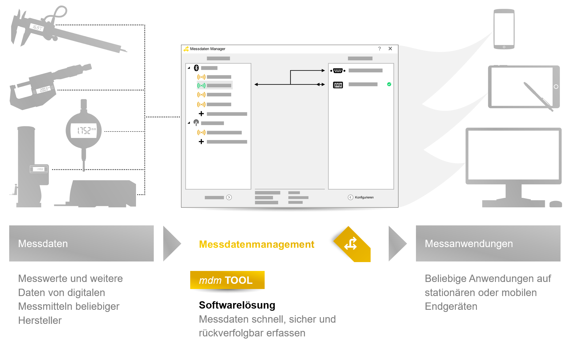Mit unserer rein softwarebasierten Lösung mdm TOOL können Sie beliebig viele Messgeräte auf einem Endgerät (z. B. Tablet-PC, Desktop-PC, Smartphone) kanalisieren, unabhängig von der Art der Messgeräteanbindung (kabelgebunden oder kabellos).
