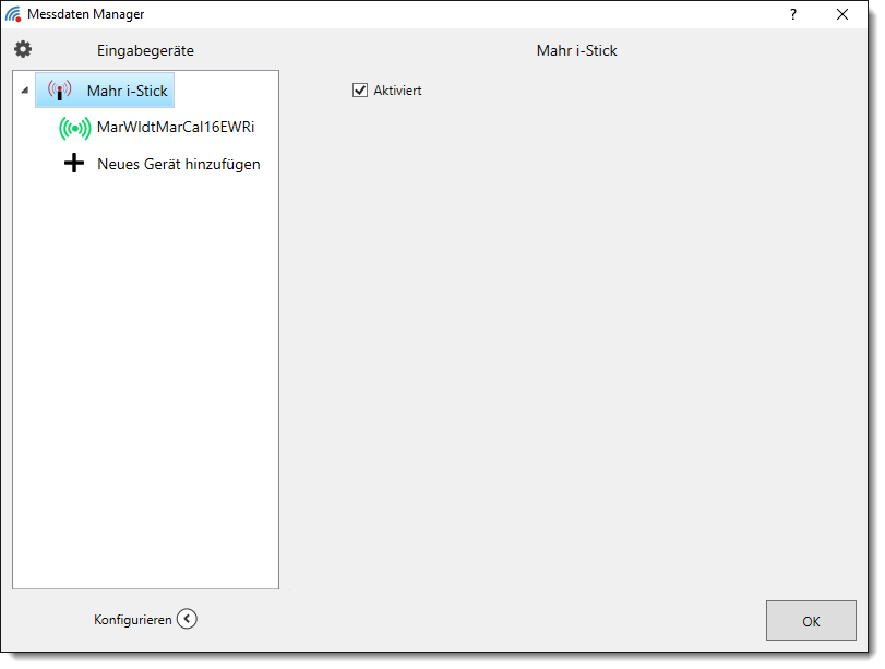 Im Konfigurationsfenster können Sie das Messmittel mittels der Check-Box Aktiviert deaktivieren oder aktivieren.