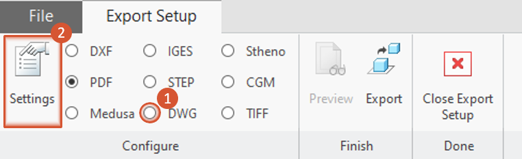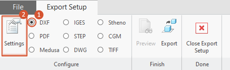 2 Open “Export settings” menu Select DXF (1) and click on Settings (2).
