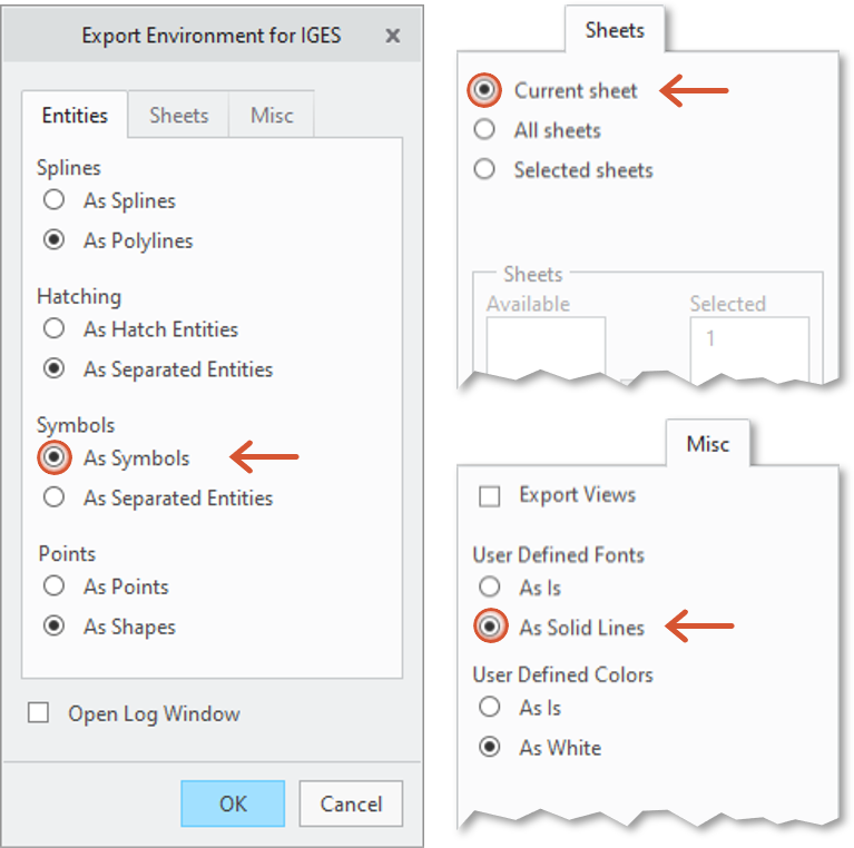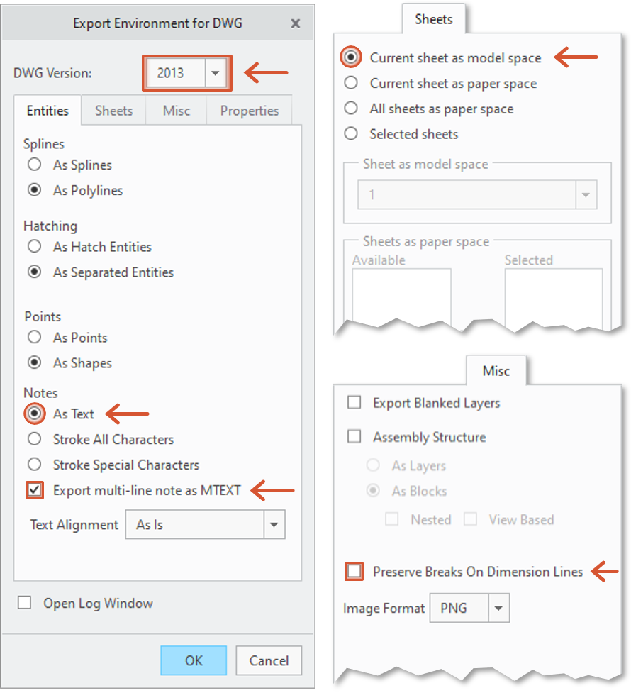 3 Customize export settings Select the following settings on the Elements, Sheets and Miscellaneous tabs. Necessary settings are marked.
