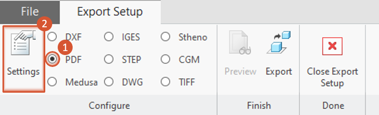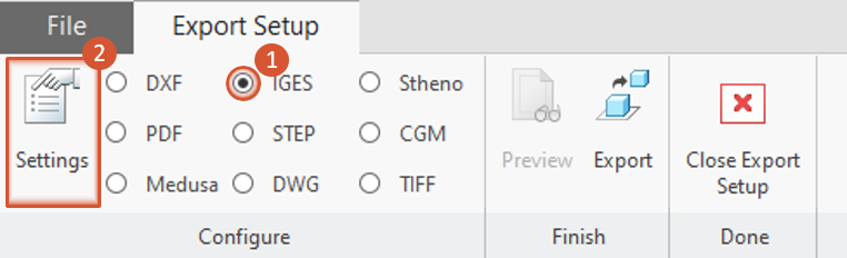 2 Open “Export settings” menu Select IGES (1) and click on Settings (2).