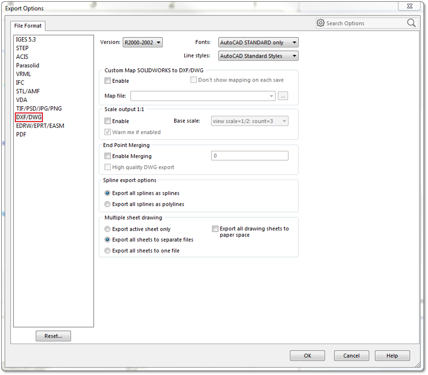 2 Open Export options menu Select Dxf (*.dxf) as the file type and click on Options.