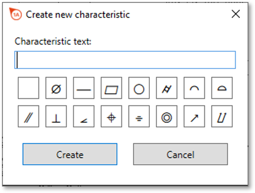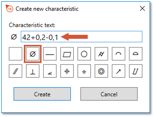 | 5 | Merkmalstext eingeben | Geben Sie die relevanten Zeichen des Merkmals im Feld “Merkmalstext” über die Tastatur ein. Nutzen Sie die Geometriesymbole darunter, falls dies erforderlich ist. Hinweis 1 Um ein Geometriesymbol wieder zu entfernen, nutzen Sie die Blankoschaltfläche. Hinweis 2 Der eingegebene Text wird in ein vollwertiges Merkmal umgewandelt und nicht etwa als Hinweistextmerkmal gespeichert (Es sei denn, es handelt sich um einen Hinweistext). | Beispielhaft möchten wir ein Durchmesser-Passpaß 22 H7 als Merkmal anlegen. Wir klicken die Schaltfläche ⌀ an und geben “22 H7” ein: |