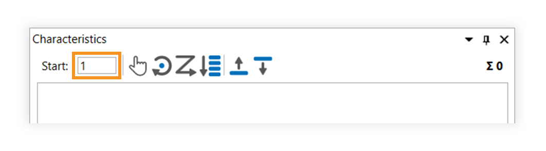 | 3 | Check/set start value for the numbering | 1) Define the start value in the window Characteristic properties. The number is assigned to the first characteristic in the test plan during stamping that is stored in the settings (see Customization > Settings > Stamp) as a start value, by default “1”. Each additional stamp receives a number incremented by the set increment. The counter will be at the lowest possible value if characteristics are already present in the test plan. | The counter for the numbering in the example is set as required at “1”: |