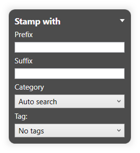 | 2) In the “Stamp with” dialog box, define properties that should be taken into account when stamping: - Prefix, Suffix - Categorie - Tag | 2) The stamp properties are correctly selected. | ||