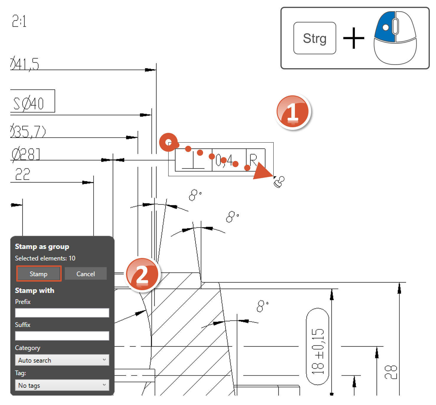 | 4c | Gruppe stempeln | 1) Bewegen Sie den Mauszeiger ( | 1) Im Dialogfenster “Als Gruppe stempeln” wird zur Kontrolle die Anzahl der erkannten Elemente angezeigt, im Beispiel sind es zehn. Dabei handelt es sich um die Vektor- und Textelemente, aus welchem der Zeichnungseintrag aufgebaut ist. |