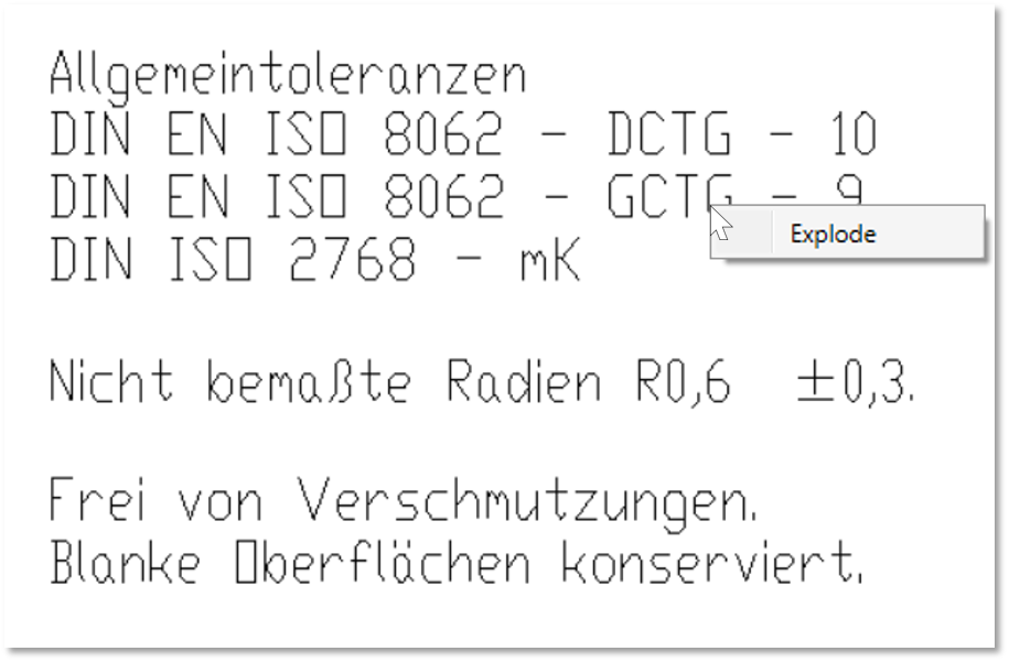 An entry in a drawing formatted in a →drawing data format (DXF, DWG, IGES) will be highlighted when you pass over it with the stamp tool. This way, you can see which files will be accessed when stamping this entry. The standards for drawing formats are intended to ensure that each drawing entry is exported from the CAD system as an standalone group of vector elements (text block). If this is not the case, you can deconstruct a text block into smaller elements using the Deconstruct text block function.