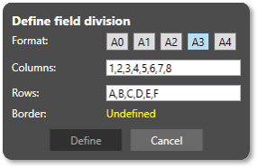 | 2 | Customize division | If necessary, adjust the tags for columns and rows. Letters and numbers, even with multiple digits, are entered in the fields separated by a comma. The field divisions for the formats A0 to A4 can be selected by button (available from program version 1.2.0.30; according to ISO 5457:1999). | The field division tags have been defined. |